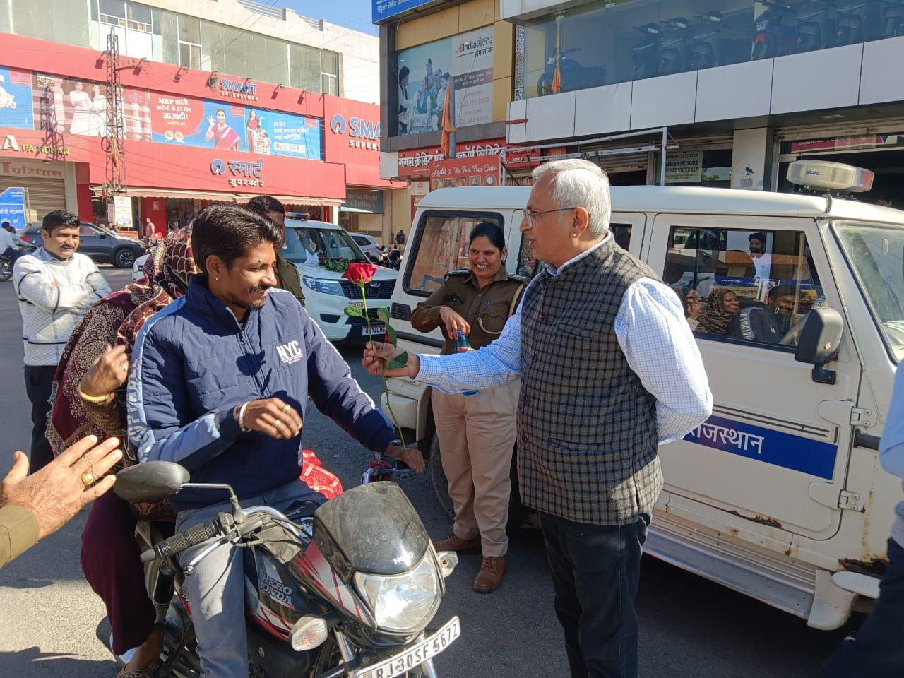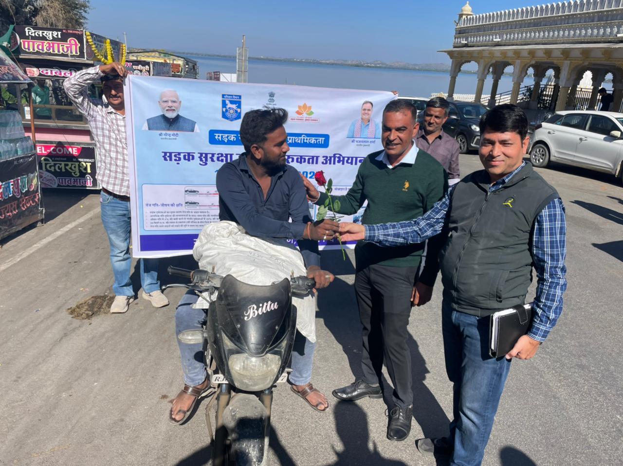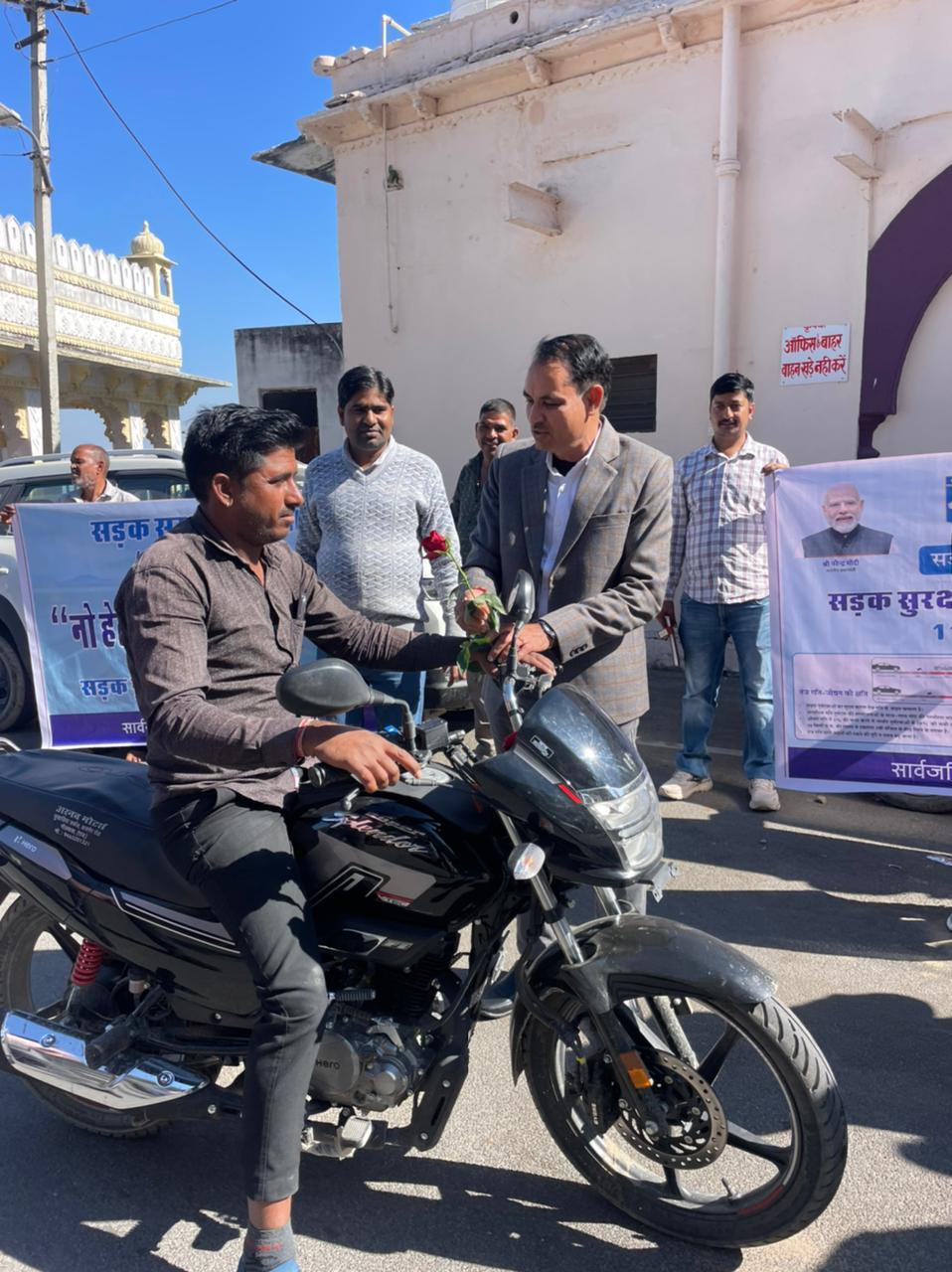 12_12_2025_RAJSAMAND_PRESS_NOTE_03---------------------------------------राज्य सरकार के दो वर्ष पूर्ण:सड़क सुरक्षा अभियान के तहत फूल-चॉकलेट देकर की सकारात्मक समझाइशपुलिस, परिवहन और पीडबल्यूडी की टीम ने चलाया अभियान25 दिसंबर तक चलेगा अभियान, आमजन को करेंगे सड़क सुरक्षा के प्रति जागरूक फ़ोटो संलग्नराजसमंद 12 दिसंबर। मुख्यमंत्री श्री भजनलाल शर्मा के नेतृत्व में राज्य सरकार का दो वर्ष पूर्ण होने के उपलक्ष में सड़क सुरक्षा अभियान के अंतर्गत परिवहन विभाग, यातायात पुलिस एवं पीडबल्यूडी द्वारा विभिन्न स्थानों पर संयुक्त जांच अभियान चलाया गया। जिला कलक्टर अरुण कुमार हसीजा के निर्देशन में परिवहन विभाग द्वारा बिना हेलमेट एवं सीट बेल्ट नहीं लगाने वाले लगभग 115 वाहन चालकों को फूल और टॉफी देकर समझाइश की गई तथा सुरक्षित ड्राइविंग के प्रति जागरूक किया गया। अभियान में जिला परिवहन अधिकारी राघव शर्मा, परिवहन निरीक्षक अनिता पंवार तथा यातायात पुलिस सहायक उपनिरीक्षक कैलाश उपस्थित रहे।इसी तरह पीडबल्यूडी के एसई आर एल मेहता, एक्सईएन हीरालाल सालवी आदि की टीम द्वारा नौ चौकी पाल एवं अन्य स्थानों पर अभियान चला कर फूल एवं चॉकलेट देकर वाहन चालकों से कहा कि यातायात नियमों की पालना अवश्य करें क्योंकि यह आपकी सुरक्षा के लिए है। इसी क्रम में भीम उपखण्ड क्षेत्र में भी सक्रिय वाहनों की जांच की गई। यहाँ तहसीलदार भीम मनोज जैन, विकास अधिकारी भीम, मोटर वाहन उपनिरीक्षक नवीन जैन एवं पुलिस थाना भीम इंचार्ज सवाई सिंह द्वारा बिना हेलमेट-सीट बेल्ट चालकों को समझाइश दी गई। साथ ही हेलमेट एवं सीट बेल्ट का नियमित उपयोग करने वाले जिम्मेदार वाहन चालकों को चॉकलेट और फूल देकर प्रोत्साहित किया गया।-----------------------सूचना एवं जनसम्पर्क कार्यालय,राजसमंद-313324