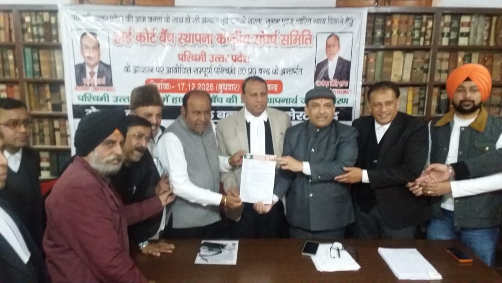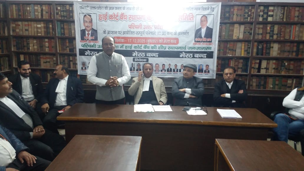 मेरठ - पशिचमी उत्तर प्रदेश में हाई कोर्ट बेंच की स्थापना की पुरजोर मांग के लिए 17 दिसंबर 2025 को मेरठ बन्द हेतु पंजाबी समाज महासमिति उत्तर प्रदेश ने अपना पूर्ण समर्थन मेरठ बार एसोसिएशंस को दिया संरक्षक विपिन सोढ़ी के आवाहन पर प्रदेश अध्यक्ष निशांत परुथी के नेतृत्व में महा समिति के सदस्यों का एक प्रतिनिधि मंडल मेरठ बार एसोसिएशन के अध्यक्ष एडवोकेट संजय शर्मा तथा महामंत्री एडवोकेट राजेंद्र सिंह राणा से मिला और उन्हें अपना समर्थन पत्र सोपा महासमिति ने साफ कहा कि वर्षों से लंबित यह मांग अब निर्णायक मोड़ पर है और उन्होंने अधिवक्ताओं की संघर्ष को जन आंदोलन का स्वर देने का भरोसा दिया प्रदेश अध्यक्ष निशांत परुथी ने कहा कि पशिचमी उत्तर प्रदेश के करोड़ों लोगों को न्याय तक आसान पहुंच दिलाना अब समय की जरूरत है उन्होंने कहा कि अधिवक्ताओं की हर लड़ाई में पंजाबी समाज कंधे से कंधा मिलाकर खड़ा रहेगा उन्होंने अधिवक्ताओं को आश्वस्त करते हुए कहा कि यह मुहिम अब पीछे नहीं हटेगी उन्होंने पशिचमी उत्तर प्रदेश केसभी जिलों के पंजाबी समाज के व्यापारियों से अपील की कि वे भी इस अवसर पर 17 दिसंबर को बन्द का पूर्ण समर्थन करते हुए अपनी प्रतिष्ठा बंद रखें इस अवसर पर प्रतिनिधि मंडल ने कहा कि हाई कोर्ट बेंच मिलना सिर्फ अधिवक्ताओं का ही नहीं बल्कि जनता का भी अधिकार है महा समिति ने सरकार से इस मुद्दे पर शीघ्र सरकार सकारात्मक निर्णय लेने की अपील की। इस अवसर पर संरक्षक विपिन सोढ़ी, प्रदेश अध्यक्ष निशान परूथी के साथ नीरज नारंग अमोल गंभीर हरप्रीत मान गुरमीत सहानी हरेंद्र प्रीत सिंह हरविंदर सिंह सुनील टोनी भवनेश मेहता जसमीत सिंह चड्ढा सुनील अरोड़ा (पाली) मीडिया संयोजक प्रवीण सरीन तथा मनमोहन ढल आदि उपस्थित रहे