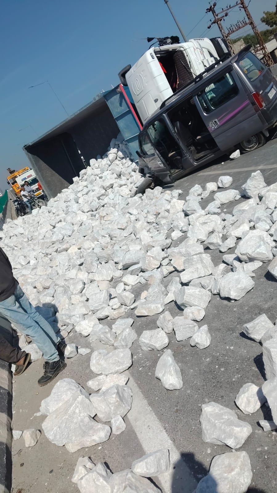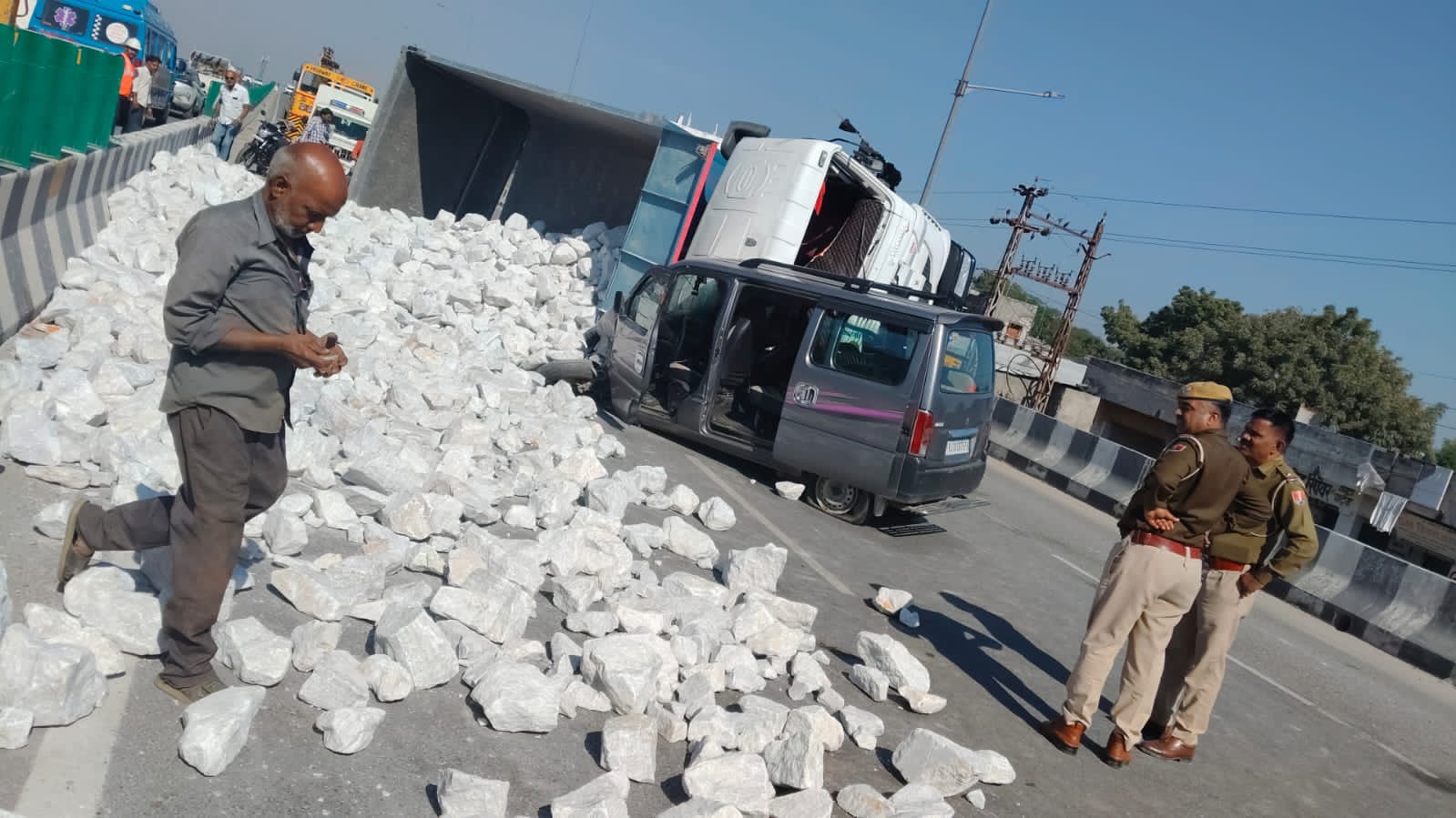 राजसमंद जिले के केलवा थाना क्षेत्र में शुक्रवार सुबह बड़ा हादसा होते-होते टल गया। मार्बल पत्थर से भरे ओवरलोड डंपर ने पीछे से आ रही कार को जोरदार टक्कर मार दी। टक्कर इतनी जबरदस्त थी कि डंपर बेकाबू होकर हाईवे पर ही पलट गया और उसमे भरे भारी पत्थर सड़क पर बिखर गए।