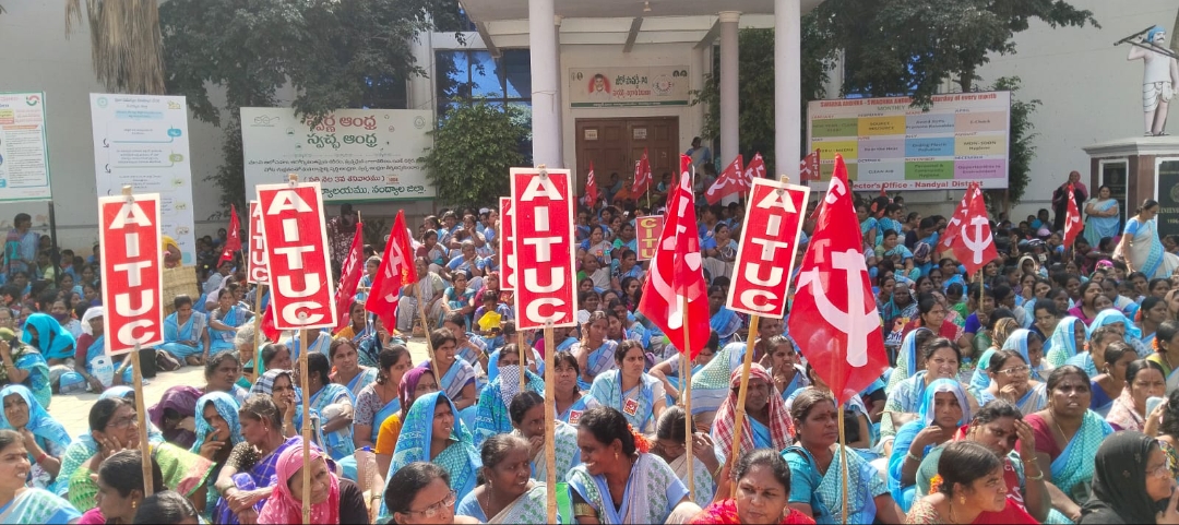అంగన్వాడీలకు కనీస వేతనం 26,000 ఇవ్వాలని పెండింగ్ లో ఉన్న 1810 మినీ సెంటర్లకు క్వాలిఫికేషన్ రిలాక్సేషన్ ఇచ్చి మెయిన్ సెంటర్ లగా మార్చాలని హెల్పర్ల ప్రమోషన్లకు నిర్దిష్టమైన గైడెన్స్ రూపొందించి అమలు చేయాలని కూటమి ప్రభుత్వం అంగన్వాడీలకు సంక్షేమ పథకాలు అమలు చేయాలని కోరుతూ ఈరోజు సిఐటియు ఎఐటియుసి అంగన్వాడీ వర్కర్స్ హెల్పర్స్ యూనియన్ లు రాష్ట్ర కమిటీల పిలుపులో భాగంగా ఈరోజు నంద్యాల పట్టణంలోని నూనెపల్లె ఫ్లైఓవర్ బ్రిడ్జి సెంటర్ నుండి భారీ ర్యాలీ నిర్వహించి అనంతరం కలెక్టర్ కార్యాలయం ముందు ధర్నా నిర్వహించి అనంతరం జాతీయ రహదారిపై దాదాపు గంటసేపు రాస్తారోకో నిర్వహించడం జరిగింది. ఈ ధర్నా కార్యక్రమాలకు సిఐటియు అంగన్వాడీ యూనియన్ జిల్లా అధ్యక్ష కార్యదర్శులు శోభారాణి ఎం నిర్మల సిఐటియు జిల్లా అధ్యక్షులు వి ఏసురత్నం జిల్లా కార్యదర్శులు వి బాల వెంకట్ డి లక్ష్మణ్ వెంకట లింగం జిల్లా ఉపాధ్యక్షులు కే యం డి గౌస్ సీనియర్ నాయకులు తోట మద్దులు ఎఐటియుసి అంగన్వాడీ యూనియన్ నాయకురాలు జులేకాబి, వసుంధర, ఎఐటియుసి జిల్లా ప్రధాన కార్యదర్శి సుంకయ్య రాష్ట్ర నాయకులు రమేష్ శ్రీనివాసులు, నాగరాముడు సీతామహాలక్ష్మి ల నాయకత్వంలో ఈ ర్యాలీ ధర్నా రాస్తారోకో నిర్వహించడం జరిగింది.ఈ సందర్భంగా పై నాయకులు మాట్లాడుతూ అంగన్వాడీలకు వెంటనే రాష్ట్ర ప్రభుత్వం జోక్యం చేసుకొని వేతనాలు పెంచాలని రాష్ట్రంలో 46807 మినీ సెంటర్లను మెయిన్ సెంట్రల్ గా మార్చినప్పటికీ వారికి ఇంతవరకు పెరిగిన వేతనాలు ఇవ్వలేదని ఆ వేతనాలు వెంటనే ఇవ్వాలని ఇంకా మిగిలిన 1810 మినీ సెంటర్లను క్వాలిఫికేషన్ లేదనే పేరుతో మెయిన్ సెంటర్లుగా అప్ గ్రేడ్ చెయ్యలేదు పదవ తరగతి పాసైన సెంటర్లను కూడా అప్ ది గ్రేట్ చేయలేదు అని వీటిని వెంటనే మెయిన్ సెంట్రల్ గా మార్చాలని గ్రాడ్యుయేట్ జీవో నెంబర్ 8కు సుప్రీంకోర్టు తిరుపతి ప్రకారం గైడ్లైన్స్ రూపొందించాలని డిమాండ్ చేశారు హెల్పర్ల ప్రమోషన్లు రాజకీయ జోకాన్ని నివారించి అర్హులకు ప్రమోషన్లు ఇవ్వాలని అన్నారు . ప్రాథమిక పాఠశాలలో అంగన్వాడి సెంటర్లను విలీనం చేయాలనే ప్రభుత్వం నిర్ణయం అంగన్వాడి సెంటర్ లకు నష్టం చేస్తుందని అంగన్వాడీల సెంటర్లను కుదించే ప్రమాదం ఉంటుందని వెంటనే ఫ్రీ స్కూల్ విద్య విడిగా కొనసాగించాలని అంగన్వాడీ బలోపేతం కోసం ప్రభుత్వం తగిన నిధులు కేటాయించాలని ఐసిడిఎస్ స్థాపన లక్ష్యానికి విరుద్ధంగా యాప్ పేరుతో పౌష్టికాహారాన్ని లబ్ధిదారులకు దూరం చేసే చర్యలు వ్యతిరేకించాలని ఐసిడిఎస్ కేంద్ర ప్రభుత్వం అరకురా నిధులు కేటాయించడం వల్ల మాతో మరణాలు శిశు మరణాలు తగ్గించడం చాలా మందకోడిగా సాగుతుందని పోషకాహారం తగినంతగా అందక ఇంకా గణనీయమైన శాతం లో పిల