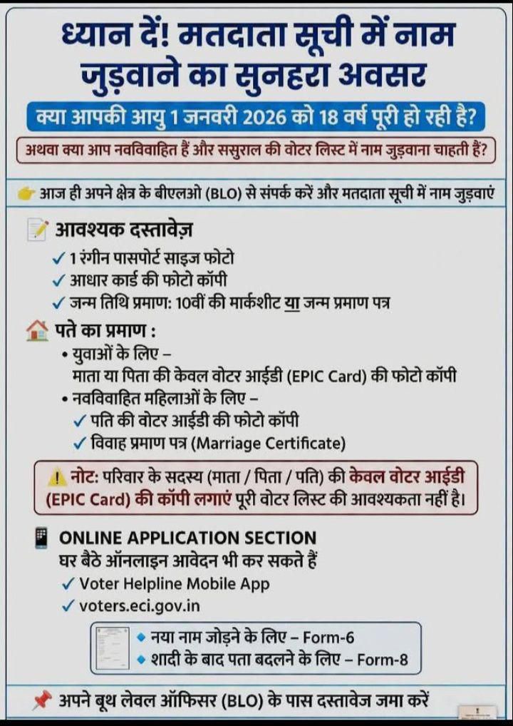 जिस लड़का या लड़की की आयु 01.01.2026 को 18 वर्ष या इससे अधिक हो रही है अथवा नवविवाहित महिलाएं अपना नाम मतदाता सूची में जुड़वा सकती है,