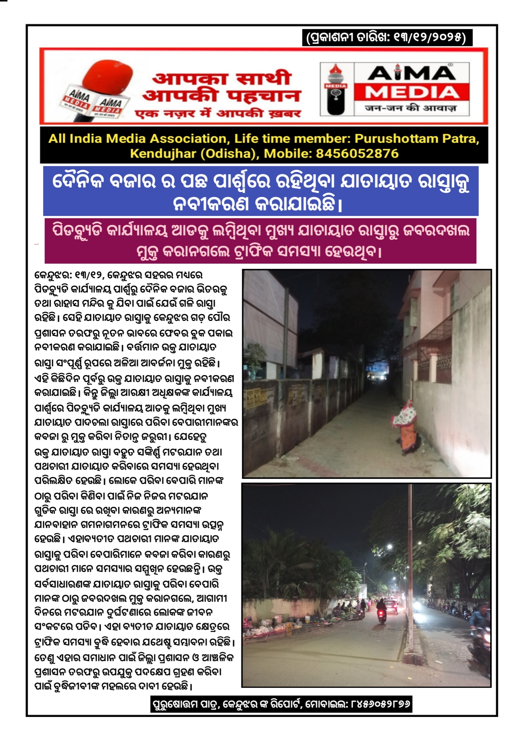 କେନ୍ଦୁଝର: ୧୩/୧୨, କେନ୍ଦୁଝର ସହରର ମଧ୍ଯରେ ପିଡବ୍ଲ୍ୟୁଡି କାର୍ଯ୍ୟାଳୟ ପାର୍ଶ୍ବରୁ ଦୈନିକ ବଜାର ଭିତରକୁ ତଥା ରାହାସ ମନ୍ଦିର କୁ ଯିବା ପାଇଁ ଯେଉଁ ଗଳି ରାସ୍ତା ରହିଛି। ସେହି ଯାତାୟାତ ରାସ୍ତାକୁ କେନ୍ଦୁଝର ଗଡ଼ ପୌର ପ୍ରଶାସନ ତରଫରୁ ନୂତନ ଭାବରେ ଫେବର ବ୍ଲକ ପକାଇ ନବୀକରଣ କରାଯାଇଛି। ବର୍ତ୍ତମାନ ଉକ୍ତ ଯାତାୟାତ ରାସ୍ତା ସଂପୂର୍ଣ୍ଣ ରୂପରେ ଅଳିଆ ଆବର୍ଜନା ମୁକ୍ତ ରହିଛି। ଏହି କିଛିଦିନ ପୂର୍ବରୁ ଉକ୍ତ ଯାତାୟାତ ରାସ୍ତାକୁ ନବୀକରଣ କରାଯାଇଛି। କିନ୍ତୁ ଜିଲ୍ଲା ଆରକ୍ଷୀ ଅଧିକ୍ଷକଙ୍କ କାର୍ଯ୍ୟାଳୟ ପାର୍ଶ୍ବରେ ପିଡବ୍ଲ୍ୟୁଡି କାର୍ଯ୍ୟାଳୟ ଆଡକୁ ଲମ୍ବିଥିବା ମୁଖ୍ଯ ଯାତାୟାତ ପାଦଚଲା ରାସ୍ତାରେ ପରିବା ବେପାରୀମାନଙ୍କର କବଜା ରୁ ମୁକ୍ତ କରିବା ନିତାନ୍ତ ଜରୁରୀ। ଯେହେତୁ ଉକ୍ତ ଯାତାୟାତ ରାସ୍ତା ବହୁତ ସଙ୍କିର୍ଣ୍ଣ ମଟରଯାନ ତଥା ପଥଚାରୀ ଯାତାୟାତ କରିବାରେ ସମସ୍ୟା ହେଉଥିବା ପରିଲକ୍ଷିତ ହେଉଛି। ଲୋକେ ପରିବା ବେପାରି ମାନଙ୍କ ଠାରୁ ପରିବା କିଣିବା ପାଇଁ ନିଜ ନିଜର ମଟରଯାନ ଗୁଡିକ ରାସ୍ତା ରେ ରଖିବା କାରଣରୁ ଅନ୍ୟମାନଙ୍କ ଯାନବାହାନ ଗମନାଗମନରେ ଟ୍ରାଫିକ ସମସ୍ୟା ଉତ୍ପନ୍ନ ହେଉଛି। ଏହାବ୍ୟତୀତ ପଥଚାରୀ ମାନଙ୍କ ଯାତାୟାତ ରାସ୍ତାକୁ ପରିବା ବେପାରିମାନେ କବଜା କରିବା କାରଣରୁ ପଥଚାରୀ ମାନେ ସମସ୍ୟାର ସମ୍ମୁଖିନ ହେଉଛନ୍ତି। ଉକ୍ତ ସର୍ବସାଧାରଣଙ୍କ ଯାତାୟାତ ରାସ୍ତାକୁ ପରିବା ବେପାରି ମାନଙ୍କ ଠାରୁ ଜବରଦଖଲ ମୁକ୍ତ କରାନଗଲେ, ଆଗାମୀ ଦିନରେ ମଟରଯାନ ଦୁର୍ଘଟଣାରେ ଲୋକଙ୍କ ଜୀବନ ସଂକଟରେ ପଡିବ। ଏହା ବ୍ୟତୀତ ଯାତାୟାତ କ୍ଷେତ୍ରରେ ଟ୍ରାଫିକ ସମସ୍ୟା ବ୍ରୁଦ୍ଧି ହେବାର ଯଥେଷ୍ଟ ସମ୍ଭାବନା ରହିଛି। ଏହାର ସ୍ଥାୟୀ ସମାଧାନ ପାଇଁ ଜିଲ୍ଲା ପ୍ରଶାସନ ଓ ଆଞ୍ଚଳିକ ପ୍ରଶାସନ ତରଫରୁ ଉପଯୁକ୍ତ ପଦକ୍ଷେପ ଗ୍ରହଣ କରିବା ନିତାନ୍ତ ଜରୁରୀ।