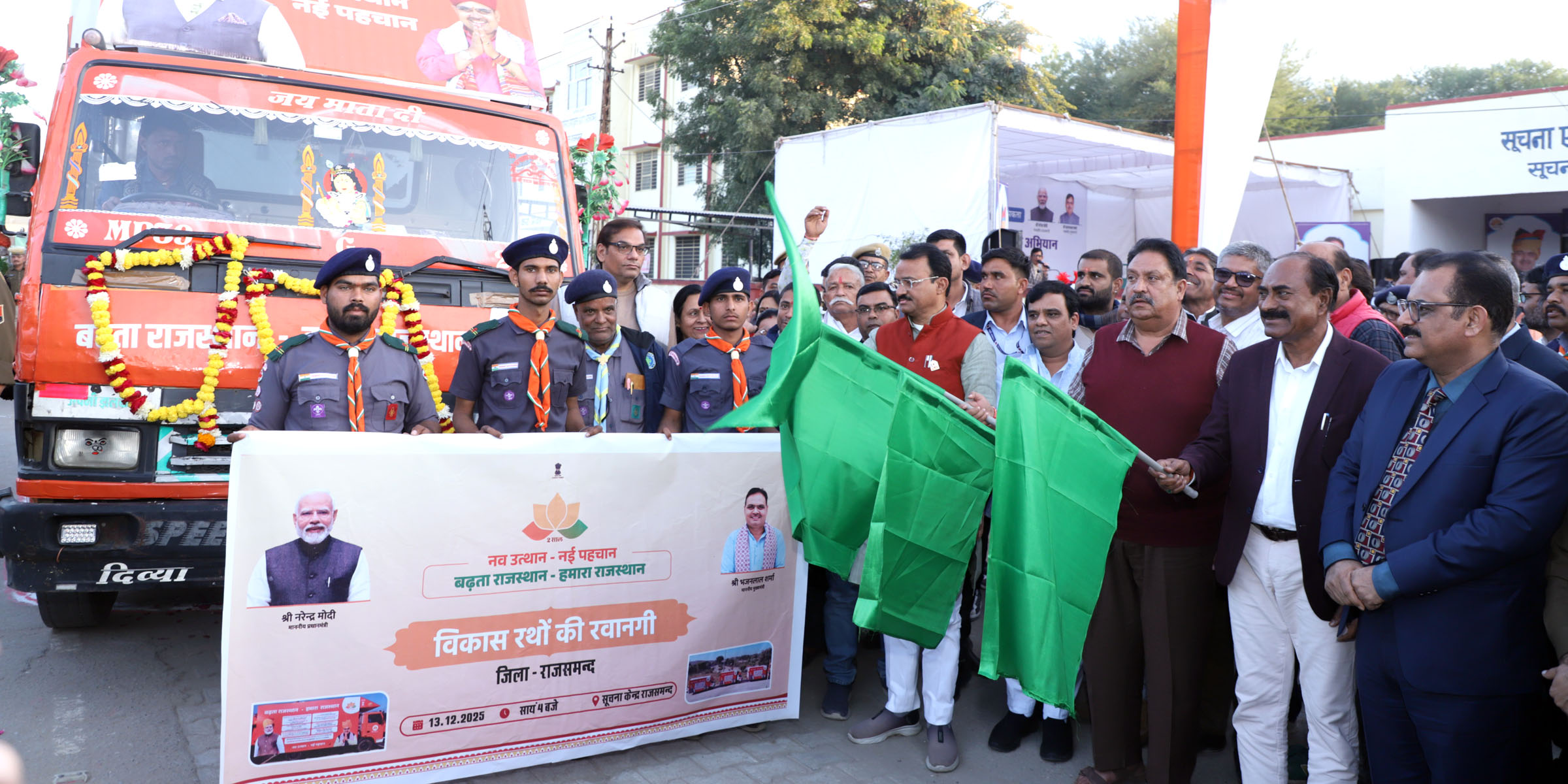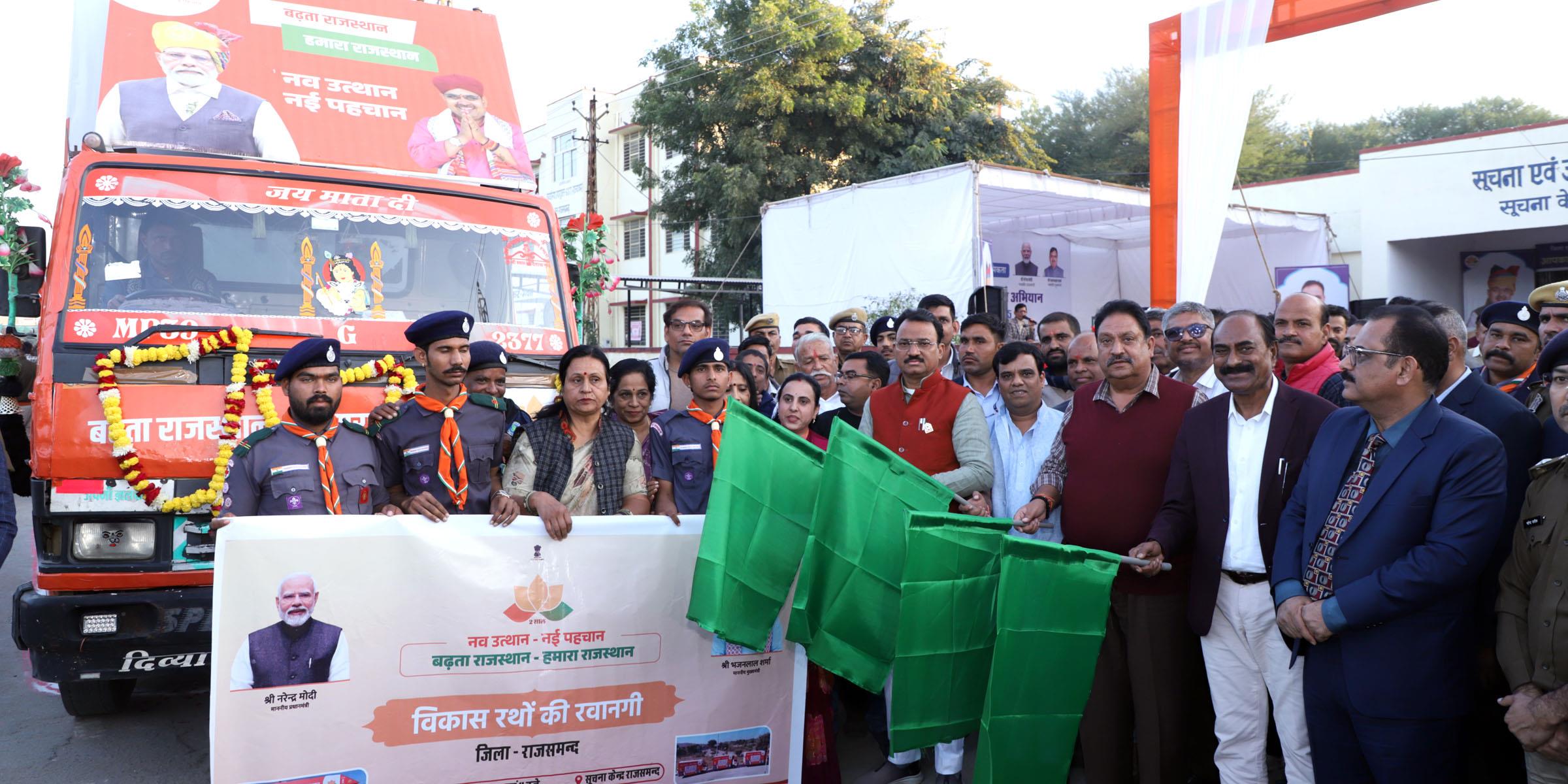 राजसमंद 13 दिसंबर। उप मुख्यमंत्री एवं जिला प्रभारी मंत्री डॉ. प्रेमचंद बैरवा ने शनिवार को सूचना केंद्र परिसर में जिले की चारों विधानसभा क्षेत्रों के लिए 'विकास रथों' को हरी झंडी दिखाकर रवाना किया। इसके पश्चात सूचना केंद्र में प्रेस ब्रीफिंग करते हुए राज्य सरकार की प्रदेश में जिला स्तरीय दो वर्षों की उपलब्धियों को साझा किया।