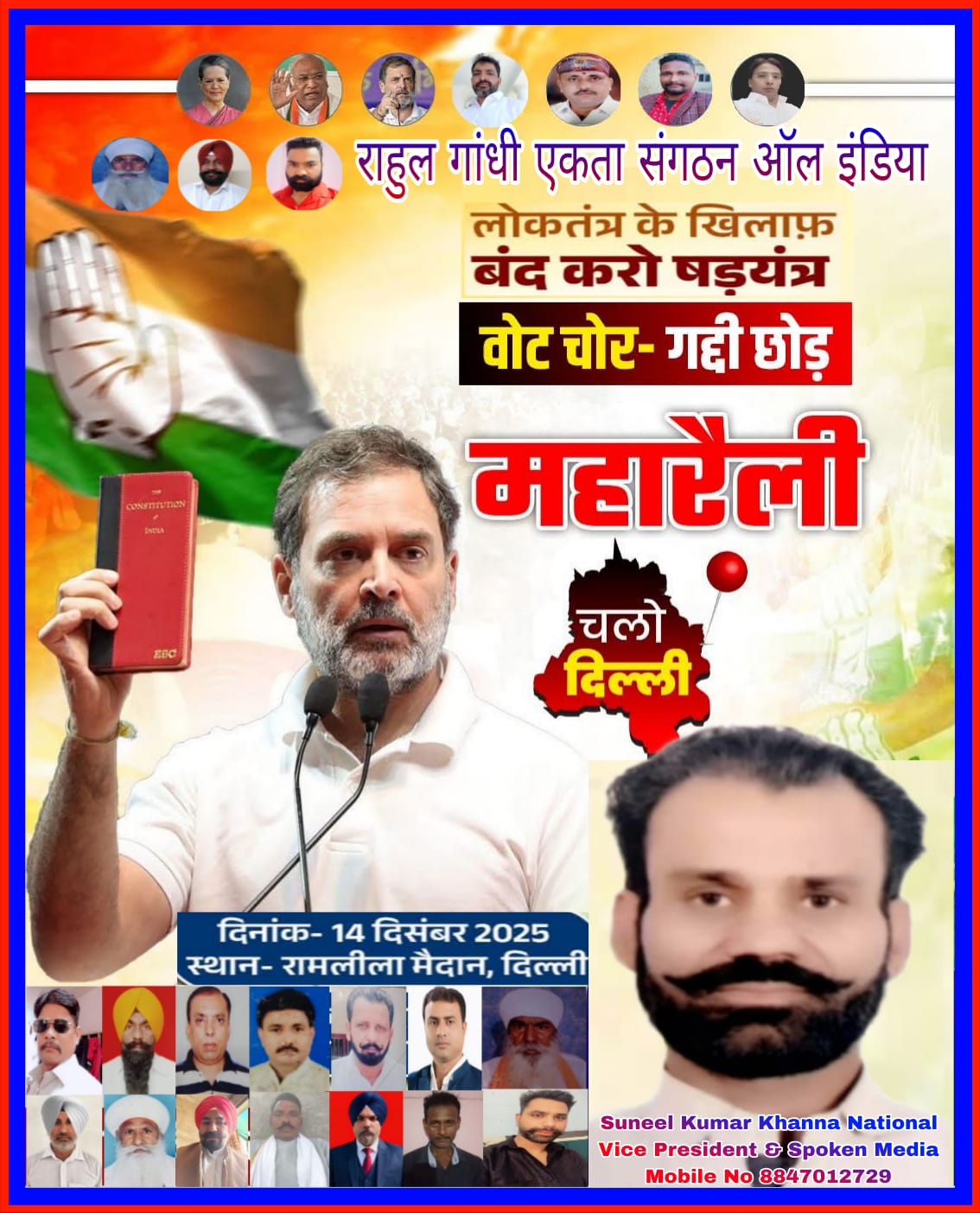 राहुल गांधी एकता संगठन,ऑल इंडिया कांग्रेस की ‘वोट चोर गद्दी छोड़’, 14/12/2025 रामलीला मैदान सुबह 11:00 बजे महारैली की तैयारियाँ तेज”,
