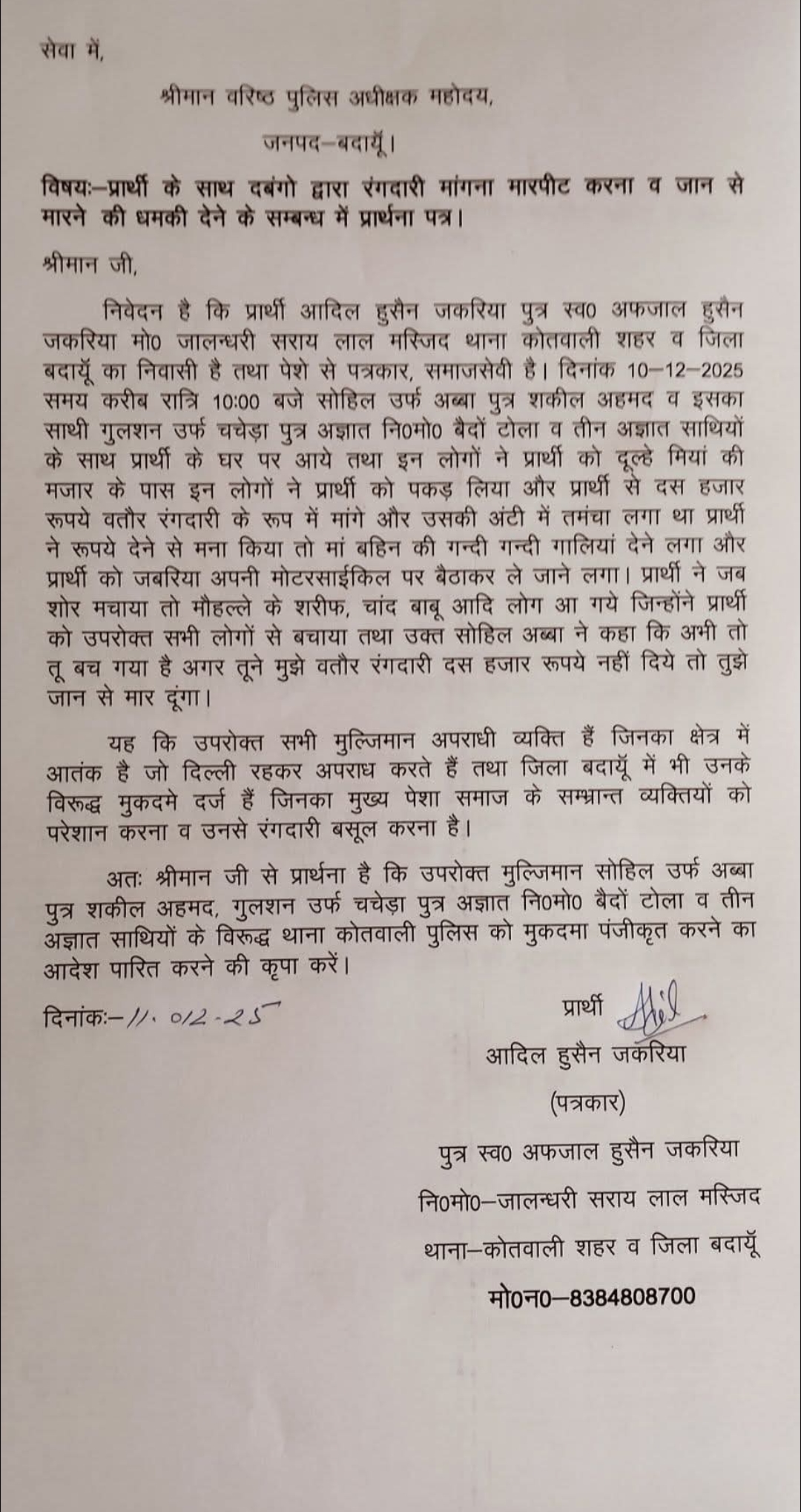 बदायूं से सोहेल हमजा की रिपोर्ट रंगदारी न देने पर जान से मारने की दी धमकी, एसएसपी से शिकायत