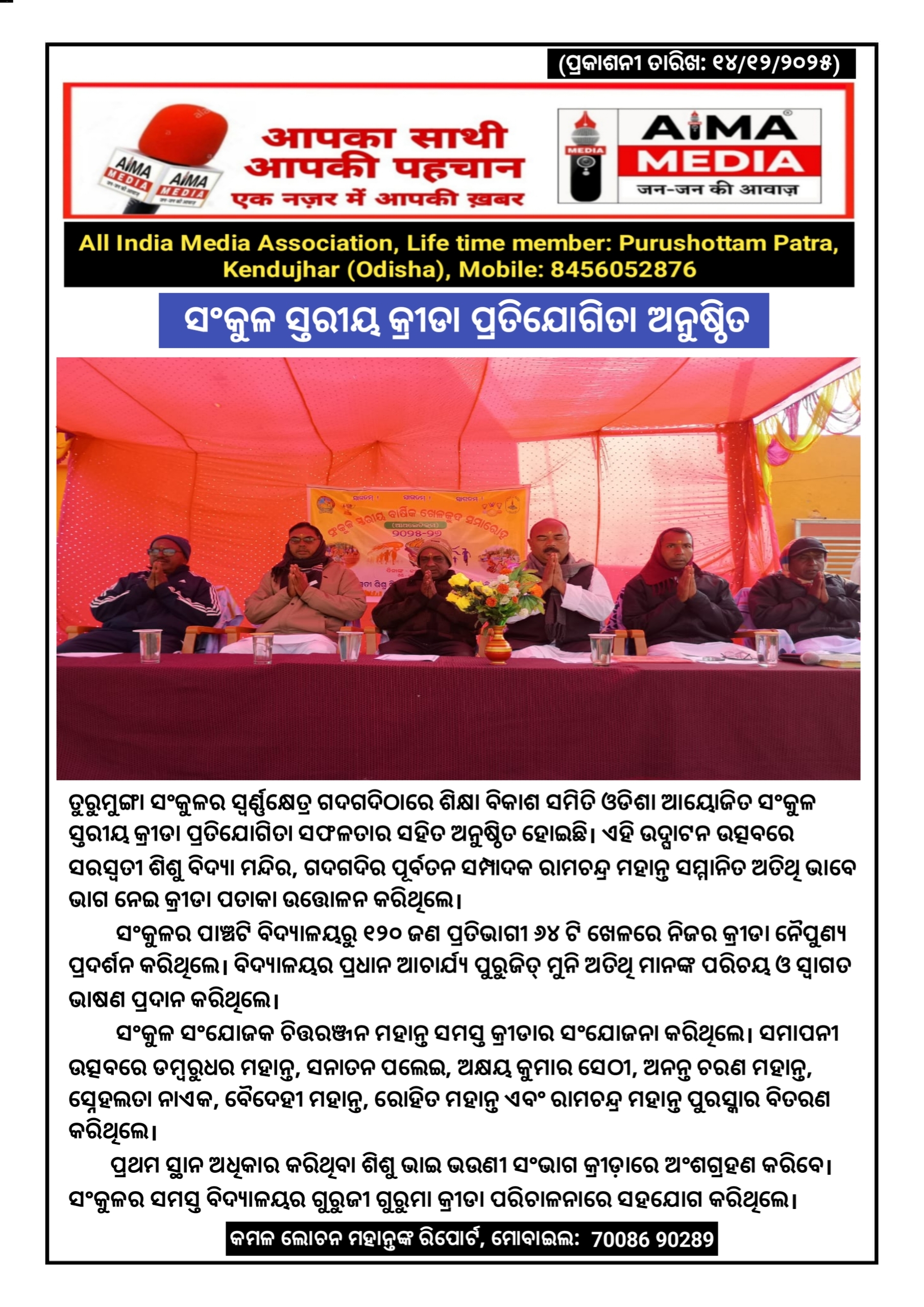 ତୁରୁମୁଙ୍ଗା ସଂକୁଳର ସ୍ୱର୍ଣ୍ଣକ୍ଷେତ୍ର ଗଦଗଦିଠାରେ ଶିକ୍ଷା ବିକାଶ ସମିତି ଓଡିଶା ଆୟୋଜିତ ସଂକୁଳ ସ୍ତରୀୟ କ୍ରୀଡା ପ୍ରତିଯୋଗିତା ସଫଳତାର ସହିତ ଅନୁଷ୍ଠିତ ହୋଇଛି। ଏହି ଉଦ୍ଘାଟନ ଉତ୍ସବରେ ସରସ୍ଵତୀ ଶିଶୁ ବିଦ୍ୟା ମନ୍ଦିର, ଗଦଗଦିର ପୂର୍ବତନ ସମ୍ପାଦକ ରାମଚନ୍ଦ୍ର ମହାନ୍ତ ସମ୍ମାନିତ ଅତିଥି ଭାବେ ଭାଗ ନେଇ କ୍ରୀଡା ପତାକା ଉତ୍ତୋଳନ କରିଥିଲେ।