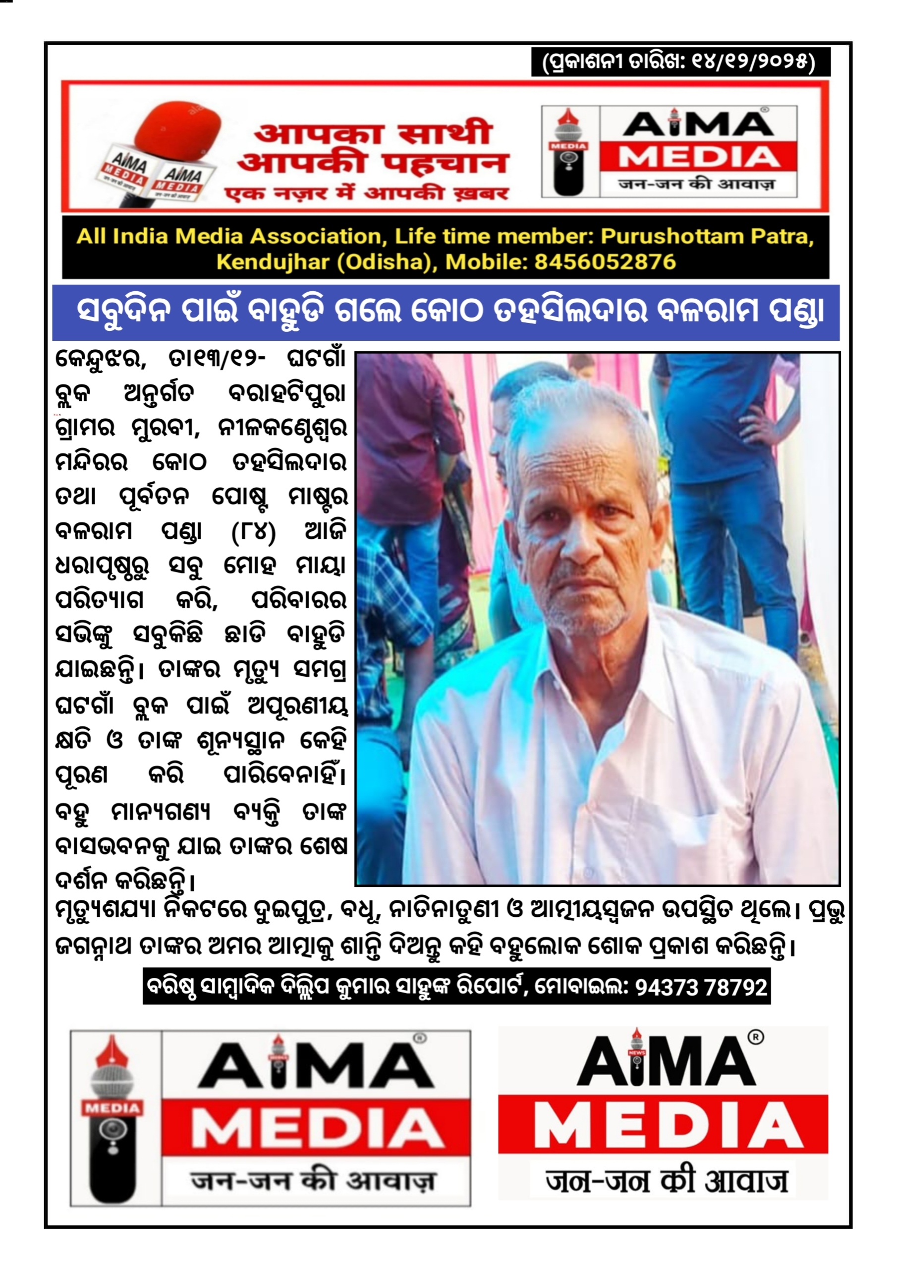 କେନ୍ଦୁଝର,ତା୧୩/୧୨- ଘଟଗାଁ ବ୍ଲକ ଅନ୍ତର୍ଗତ ବରାହଟିପୁରା ଗ୍ରାମର ମୁରବୀ, ନୀଳକଣ୍ଠେଶ୍ଵର ମନ୍ଦିରର କୋଠ ତହସିଲଦାର ତଥା ପୂର୍ବତନ ପୋଷ୍ଟ ମାଷ୍ଟର ବଳରାମ ପଣ୍ଡା (୮୪) ଆଜି ଧରାପୃଷ୍ଠରୁ ସବୁ ମୋହ ମାୟା ପରିତ୍ୟାଗ କରି, ପରିବାରର ସଭିଙ୍କୁ ସବୁକିଛି ଛାଡି ବାହୁଡି ଯାଇଛନ୍ତି।ତାଙ୍କର ମୃତ୍ୟୁ ସମଗ୍ର ଘଟଗାଁ ବ୍ଲକ ପାଇଁ ଅପୂରଣୀୟ କ୍ଷତି ଓ ତାଙ୍କ ଶୂନ୍ୟସ୍ଥାନ କେହି ପୂରଣ କରି ପାରିବେନାହିଁ। ବହୁ ମାନ୍ୟଗଣ୍ୟ ବ୍ୟକ୍ତି ତାଙ୍କ ବାସଭବନକୁ ଯାଇ ତାଙ୍କର ଶେଷ ଦର୍ଶନ କରିଛନ୍ତି। ମୃତ୍ୟୁଶଯ୍ୟା ନିକଟରେ ଦୁଇପୁତ୍ର, ବଧୂ, ନାତିନାତୁଣୀ ଓ ଆତ୍ମୀୟସ୍ବଜନ ଉପସ୍ଥିତ ଥିଲେ।ପ୍ରଭୁ ଜଗନ୍ନାଥ ତାଙ୍କର ଅମର ଆତ୍ମାକୁ ଶାନ୍ତି ଦିଅନ୍ତୁ କହି ବହୁଲୋକ ଶୋକ ପ୍ରକାଶ କରିଛନ୍ତି।