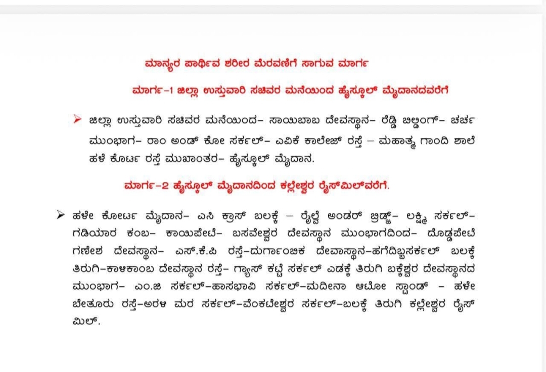 ಮಾನ್ಯ ಶಾಮನೂರು ಶಿವಶಂಕರಪ್ಪನವರ ಪಾರ್ಥಿವ ಶರೀರ ಮೆರವಣಿಗೆ ಮಾರ್ಗ ಪ್ರಕಟ