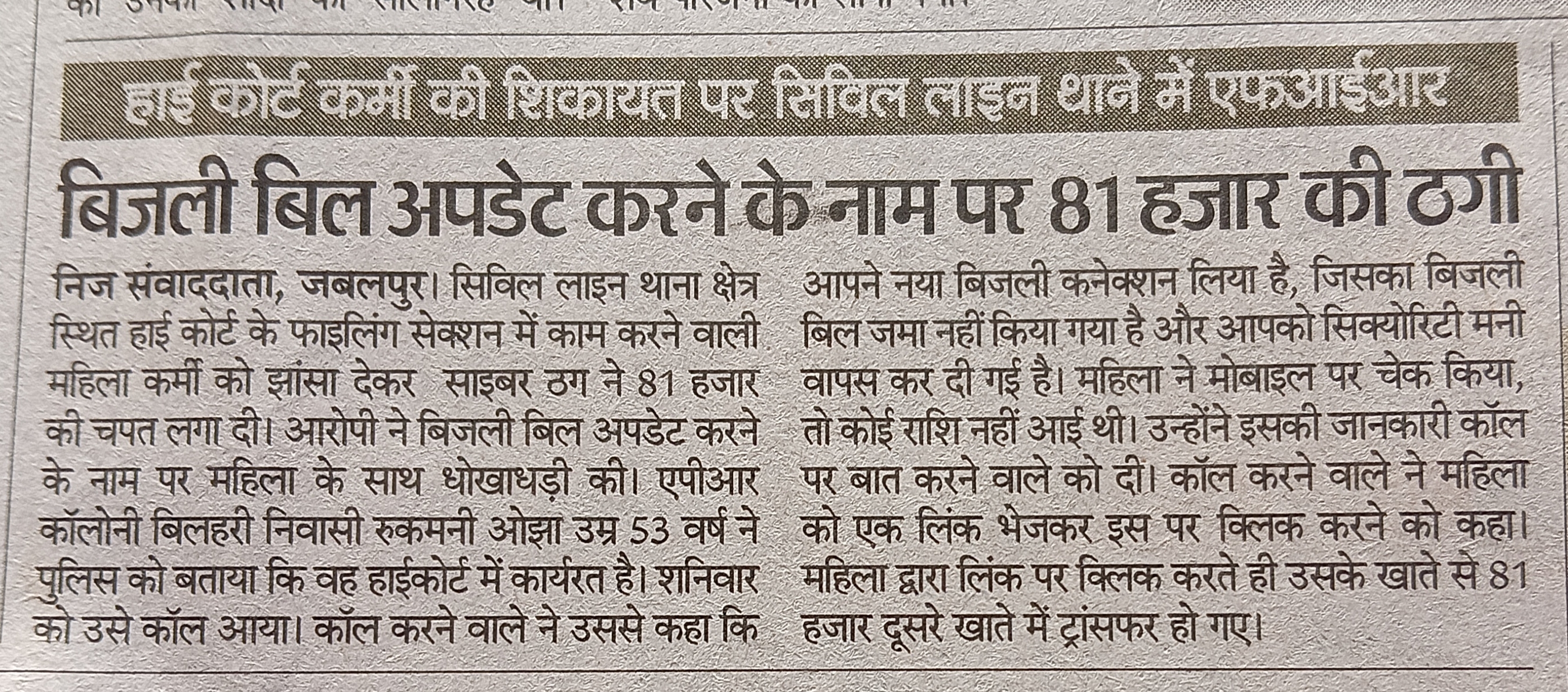 बिजली बिल अपडेट करने के नाम पर 81हजार की ठगी
