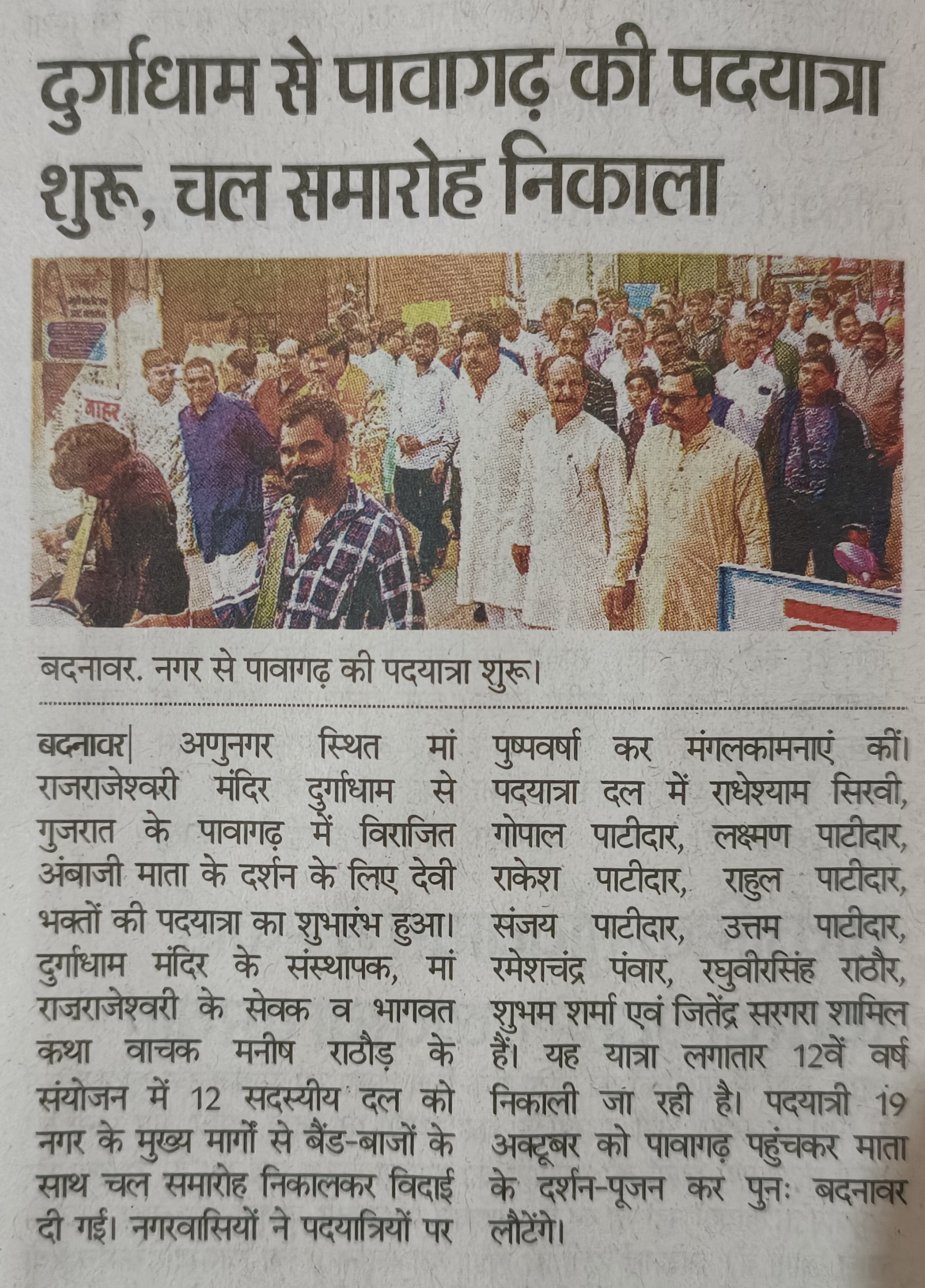 दुर्गाधाम से पावागढ़ की पदयात्रा शुरू , चल समारोह निकला ।