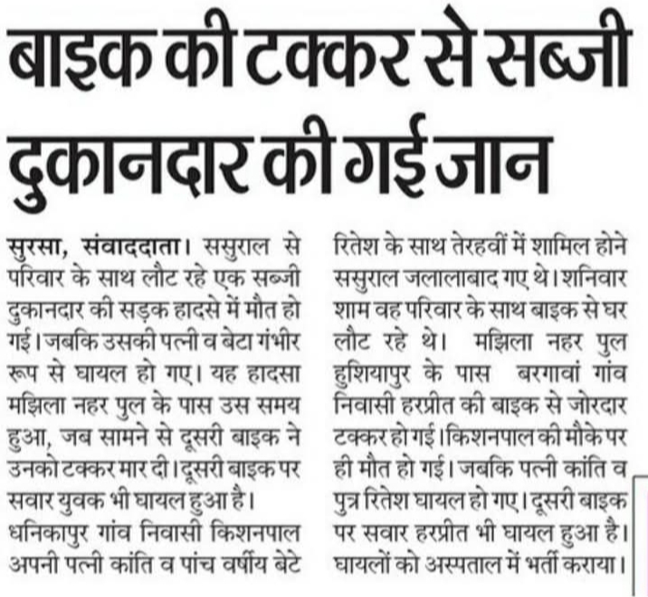 *हरदोई * बाइक की टक्कर से सब्जी दुकानदार की गई जान