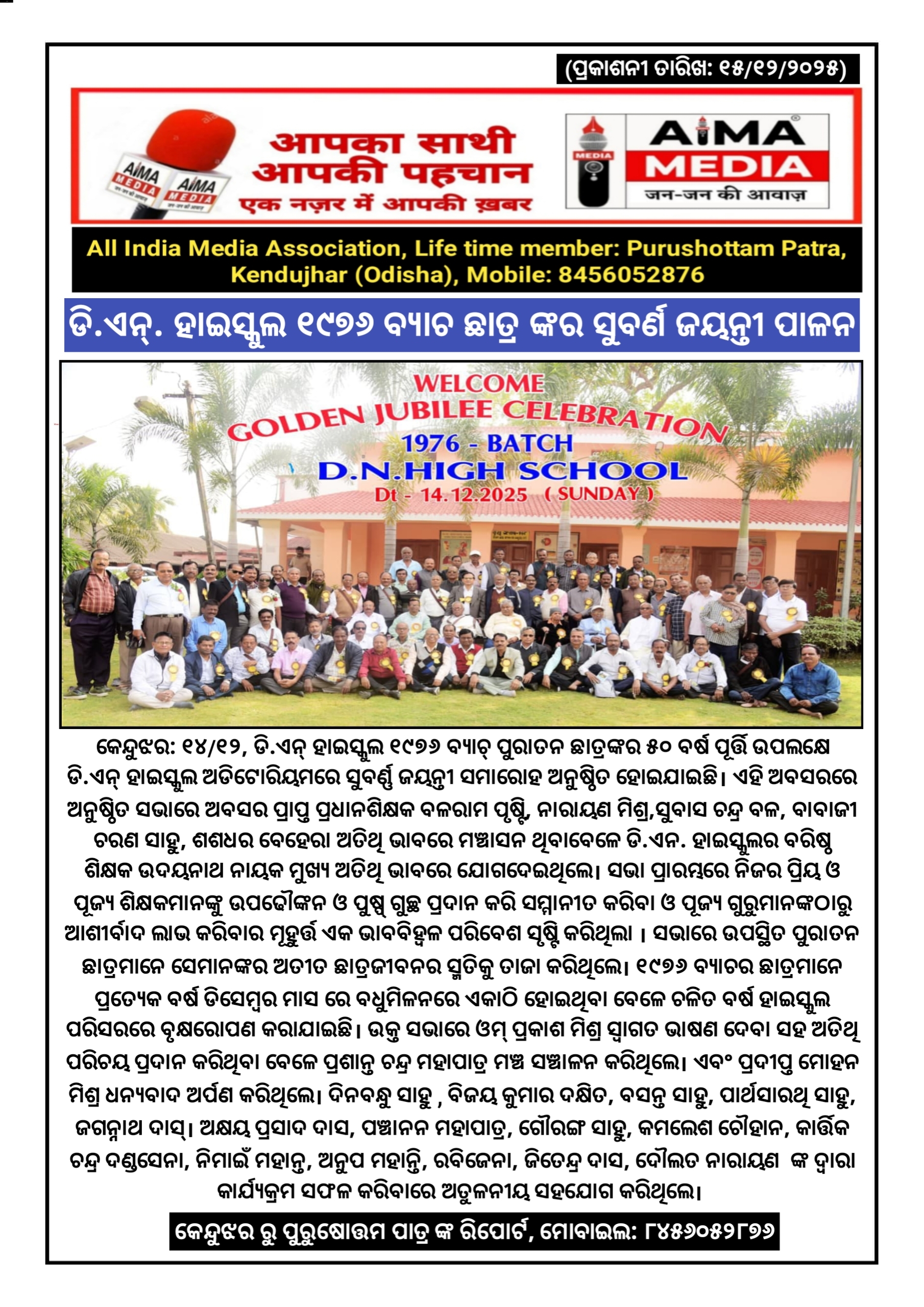 କେନ୍ଦୁଝର: ୧୪/୧୨, ଡି.ଏନ୍ ହାଇସ୍କୁଲ ୧୯୭୬ ବ୍ୟାଚ୍ ପୁରାତନ ଛାତ୍ରଙ୍କର ୫୦ ବର୍ଷ ପୂର୍ତ୍ତି ଉପଲକ୍ଷେ ଡି.ଏନ୍ ହାଇସ୍କୁଲ ଅଡିଟୋରିୟମରେ ସୁବର୍ଣ୍ଣ ଜୟନ୍ତୀ ସମାରୋହ ଅନୁଷ୍ଠିତ ହୋଇଯାଇଛି। ଏହି ଅବସରରେ ଅନୁଷ୍ଠିତ ସଭାରେ ଅବସର ପ୍ରାପ୍ତ ପ୍ରଧାନଶିକ୍ଷକ ବଳରାମ ପୃଷ୍ଟି, ନାରାୟଣ ମିଶ୍ର,ସୁବାସ ଚନ୍ଦ୍ର ବଳ, ବାବାଜୀ ଚରଣ ସାହୁ, ଶଶଧର ବେହେରା ଅତିଥି ଭାବରେ ମଞ୍ଚାସନ ଥିବାବେଳେ ଡି.ଏନ. ହାଇସ୍କୁଲର ବରିଷ୍ଠ ଶିକ୍ଷକ ଉଦୟନାଥ ନାୟକ ମୁଖ୍ୟ ଅତିଥି ଭାବରେ ଯୋଗଦେଇଥିଲେ। ସଭା ପ୍ରାରମ୍ଭରେ ନିଜର ପ୍ରିୟ ଓ ପୂଜ୍ୟ ଶିକ୍ଷକମାନଙ୍କୁ ଉପଢୌଙ୍କନ ଓ ପୁଷ୍ପ୍ ଗୁଚ୍ଛ ପ୍ରଦାନ କରି ସମ୍ମାନୀତ କରିବା ଓ ପୂଜ୍ୟ ଗୁରୁମାନଙ୍କଠାରୁ ଆଶୀର୍ବାଦ ଲାଭ କରିବାର ମୂହୁର୍ତ୍ତ ଏକ ଭାବବିହ୍ବଳ ପରିବେଶ ସୃଷ୍ଟି କରିଥିଲା । ସଭାରେ ଉପସ୍ଥିତ ପୁରାତନ ଛାତ୍ରମାନେ ସେମାନଙ୍କର ଅତୀତ ଛାତ୍ରଜୀବନର ସ୍ମତିକୁ ତାଜା କରିଥିଲେ। ୧୯୭୬ ବ୍ୟାଚର ଛାତ୍ରମାନେ ପ୍ରତ୍ୟେକ ବର୍ଷ ଡିସେମ୍ବର ମାସ ରେ ବଧୁମିଳନରେ ଏକାଠି ହୋଇଥିବା ବେଳେ ଚଳିତ ବର୍ଷ ହାଇସ୍କୁଲ ପରିସରରେ ବୃକ୍ଷରୋପଣ କରାଯାଇଛି। ଉକ୍ତ ସଭାରେ ଓମ୍ ପ୍ରକାଶ ମିଶ୍ର ସ୍ୱାଗତ ଭାଷଣ ଦେବା ସହ ଅତିଥି ପରିଚୟ ପ୍ରଦାନ କରିଥିବା ବେଳେ ପ୍ରଶାନ୍ତ ଚନ୍ଦ୍ର ମହାପାତ୍ର ମଞ୍ଚ ସଞ୍ଚାଳନ କରିଥିଲେ। ଏବଂ ପ୍ରଦୀପ୍ତ ମୋହନ ମିଶ୍ର ଧନ୍ୟବାଦ ଅର୍ପଣ କରିଥିଲେ। ଦିନବନ୍ଧୁ ସାହୁ , ବିଜୟ କୁମାର ଦକ୍ଷିତ, ବସନ୍ତ ସାହୁ, ପାର୍ଥସାରଥି ସାହୁ, ଜଗନ୍ନାଥ ଦାସ୍। ଅକ୍ଷୟ ପ୍ରସାଦ ଦାସ, ପଞ୍ଚାନନ ମହାପାତ୍ର, ଗୌରଙ୍ଗ ସାହୁ, କମଲେଶ ଚୌହାନ, କାର୍ତ୍ତିକ ଚନ୍ଦ୍ର ଦଣ୍ଡସେନା, ନିମାଇଁ ମହାନ୍ତ, ଅନୁପ ମହାନ୍ତି, ରବିଜେନା, ଜିତେନ୍ଦ୍ର ଦାସ, ଦୌଲତ ନାରାୟଣ ଙ୍କ ଦ୍ବାରା କାର୍ଯ୍ୟକ୍ରମ ସଫଳ କରିବାରେ ଅତୁଳନୀୟ ସହଯୋଗ କରିଥିଲେ।