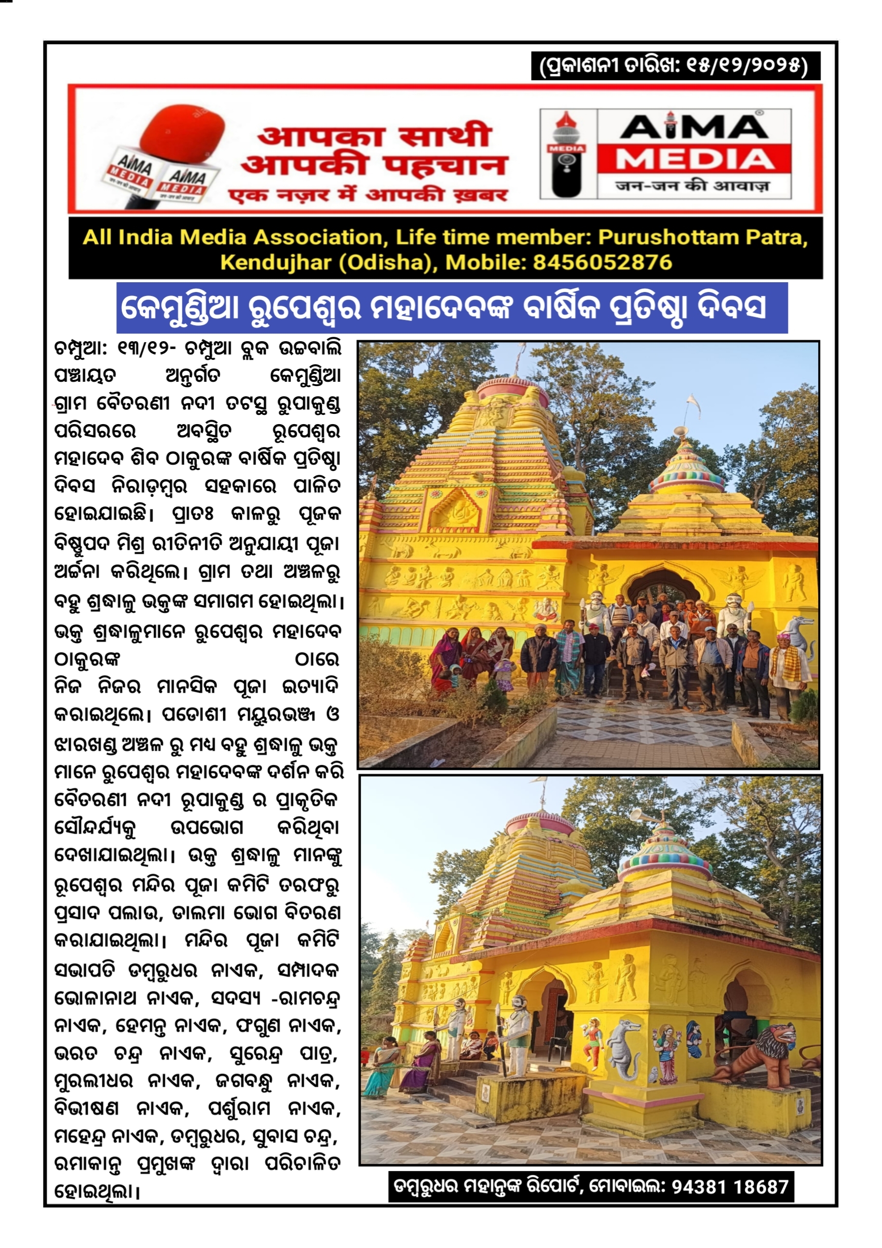 ଚମ୍ପୁଆ -13/12 ଚମ୍ପୁଆ ବ୍ଲକ ଉଚ୍ଚବାଲି ପଞ୍ଚାୟତ ଅନ୍ତର୍ଗତ କେମୁଣ୍ଡିଆ ଗ୍ରାମ ବୈତରଣୀ ନଦୀ ତଟସ୍ଥ ରୁପାକୁଣ୍ଡ ପରିସରରେ ଅବସ୍ଥିତ ରୂପେଶ୍ୱର ମହାଦେବ ଶିବ ଠାକୁରଙ୍କ ବାର୍ଷିକ ପ୍ରତିଷ୍ଠା ଦିବସ ନିରାଡ଼ମ୍ବର ସହକାରେ ପାଳିତ ହୋଇଯାଇଛି l ପ୍ରାତଃ କାଳରୁ ପୂଜକ ବିଷ୍ଣୁପଦ ମିଶ୍ର ରୀତିନୀତି ଅନୁଯାୟୀ ପୂଜା ଅର୍ଚ୍ଚନା କରିଥିଲେ l ଗ୍ରାମ ତଥା ଅଞ୍ଚଳରୁ ବହୁ ଶ୍ରଦ୍ଧାଳୁ ଭକ୍ତଙ୍କ ସମାଗମ ହୋଇଥିଲା l ଭକ୍ତ ଶ୍ରଦ୍ଧାଳୁମାନେ ରୁପେଶ୍ଵର ମହାଦେବ ଠାକୁରଙ୍କ ଠାରେ ନିଜ ନିଜର ମାନସିକ ପୂଜା ଇତ୍ୟାଦି କରାଇଥିଲେ l ପଡୋଶୀ ମୟୁରଭଞ୍ଜ ଓ ଝାରଖଣ୍ଡ ଅଞ୍ଚଳ ରୁ ମଧ୍ୟ ବହୁ ଶ୍ରଦ୍ଧାଳୁ ଭକ୍ତ ମାନେ ରୁପେଶ୍ଵର ମହାଦେବଙ୍କ ଦର୍ଶନ କରି ବୈତରଣୀ ନଦୀ ରୂପାକୁଣ୍ଡ ର ପ୍ରାକୃତିକ ସୌନ୍ଦର୍ଯ୍ୟକୁ ଉପଭୋଗ କରିଥିବା ଦେଖାଯାଇଥିଲା l ଉକ୍ତ ଶ୍ରଦ୍ଧାଳୁ ମାନଙ୍କୁ ରୂପେଶ୍ଵର ମନ୍ଦିର ପୂଜା କମିଟି ତରଫରୁ ପ୍ରସାଦ ପଲାଉ, ଡାଲମା ଭୋଗ ବିତରଣ କରାଯାଇଥିଲା l ମନ୍ଦିର ପୂଜା କମିଟି ସଭାପତି ଡମ୍ବରୁଧର ନାଏକ, ସମ୍ପାଦକ ଭୋଳାନାଥ ନାଏକ, ସଦସ୍ୟ -ରାମଚନ୍ଦ୍ର ନାଏକ, ହେମନ୍ତ ନାଏକ, ଫଗୁଣ ନାଏକ, ଭରତ ଚନ୍ଦ୍ର ନାଏକ, ସୁରେନ୍ଦ୍ର ପାତ୍ର, ମୁରଲୀଧର ନାଏକ, ଜଗବନ୍ଧୁ ନାଏକ, ବିଭୀଷଣ ନାଏକ, ପର୍ଶୁରାମ ନାଏକ, ମହେନ୍ଦ୍ର ନାଏକ, ଡମ୍ବରୁଧର, ସୁବାସ ଚନ୍ଦ୍ର, ରମାକାନ୍ତ ପ୍ରମୁଖଙ୍କ ଦ୍ଵାରା ପରିଚାଳିତ ହୋଇଥିଲା l