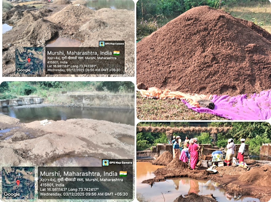 पाणी योजना ₹ ९०,४५,०००/- (अक्षरी नव्वद लाख पंचेचाळीस हजार रुपये) शासनाने खर्च करून पडत्या काळात गावात या योजनेपासून एकही थेंब पाणी मिळत नाही. शिवाय हे काम व खर्च ५० टक्के संशयास्पद असून त्याबद्दल गेले सहा महिने माहितीचा अधिकार मार्फत माहिती गोळा करणेचे काम सुरु आहे. जेणेकरून पुढील कार्यवाही सोपी होईल.परंतू दिनांक ०३/१२/२०२५ रोजी बंधाऱ्याची पाहणी करण्यास सकाळी ०९.१५ वाजता मी स्वतः बंधाऱ्याजवळ गेलो असता बंधाऱ्यात गावातील ८ ते १० महिला व १ पुरुष वाळू उत्खननाचे काम करताना आढळून आले. बंधाऱ्यात आणि बंधाऱ्याच्या बाहेर जवळ जवळ १२ ब्रास वाळू काढल्याचे दिसताच त्याच क्षणी जी.पी.एस. फोटो व मोबाईल विडीओ रेकॉर्डिंग करुन मी ठेवले. व तत्काळ मुर्शी गावचे तलाठी लोकरे यांना या गोष्टीची कल्पना दिली व ताबडतोब घटनास्थळी येऊन पाहणी करण्यास सांगितले असता तातडीने त्यांचे कोतवाल श्री. दळवी तिथे पोहोचले आणि