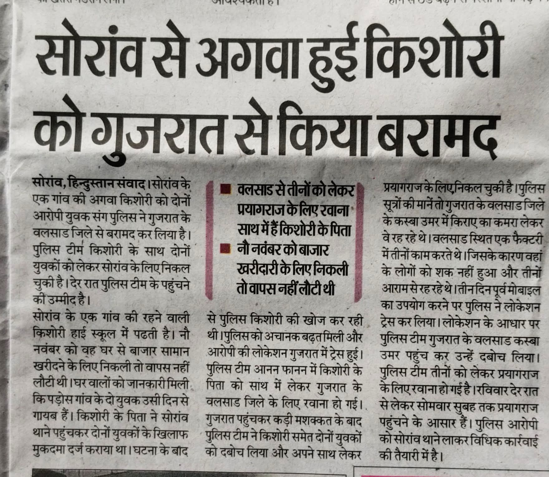 सोराव से अगवा हुई किशोरी को गुजरात से किया बरामद