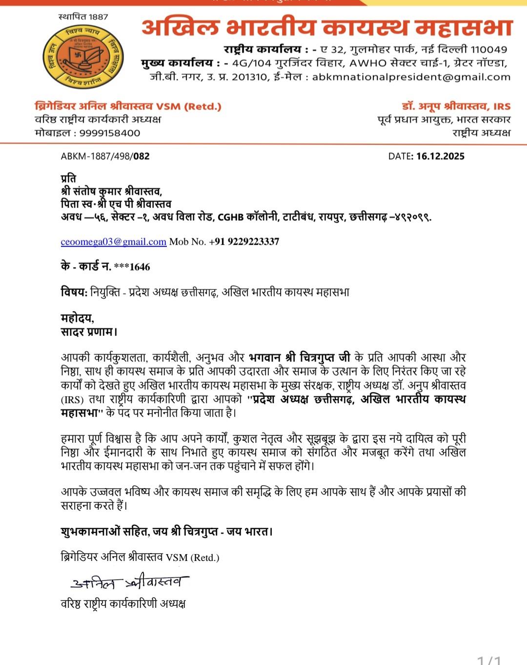 संगठन द्वारा जारी नियुक्ति पत्र में कहा गया है कि श्री श्रीवास्तव की कार्यकुशलता, नेतृत्व क्षमता, सामाजिक अनुभव तथा भगवान श्री चित्रगुप्त जी के प्रति उनकी निष्ठा को ध्यान में रखते हुए उन्हें यह महत्वपूर्ण दायित्व सौंपा गया है। महासभा को पूर्ण विश्वास है कि वे अपने कुशल नेतृत्व, ईमानदारी एवं समर्पण के साथ कायस्थ समाज को संगठित एवं सशक्त करने में महत्वपूर्ण भूमिका निभाएंगे।