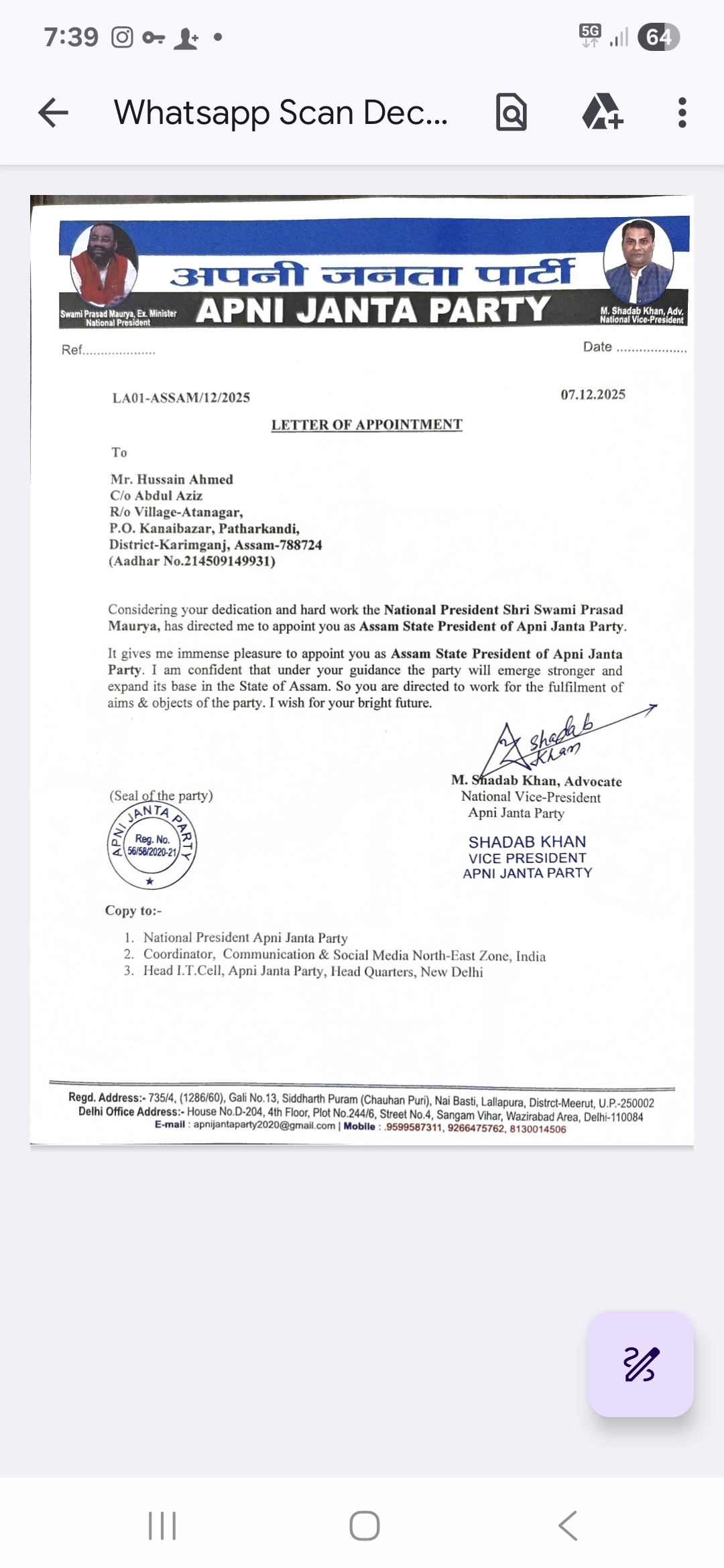 Hussain Ahmed Assam state president of Apni Janta party Assam Pradesh