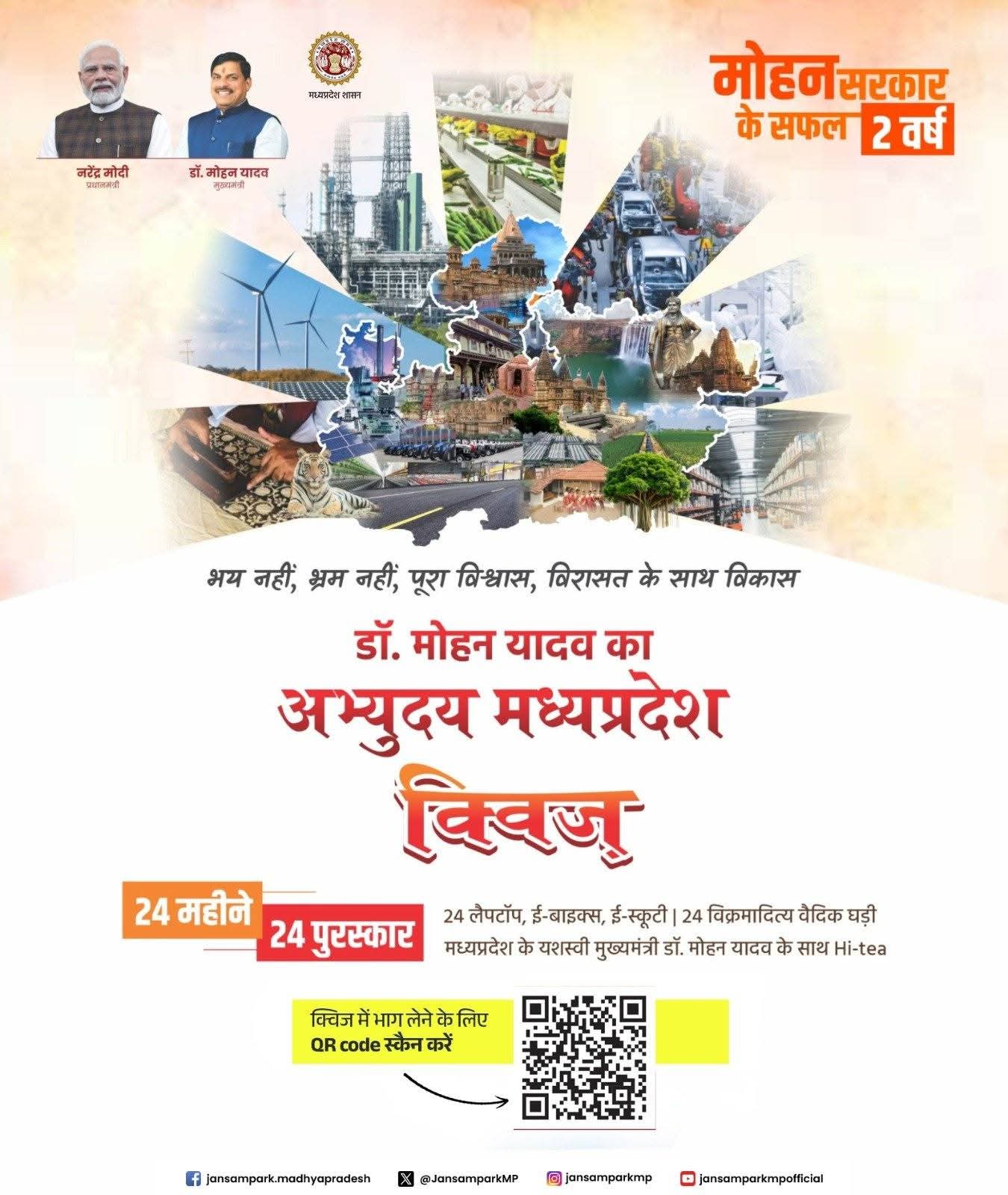 यह प्रतियोगिता मध्यप्रदेश की समृद्ध विरासत और मुख्यमंत्री डॉ. मोहन यादव के विकासशील दृष्टिकोण पर आधारित है। अपने ज्ञान का परीक्षण करें और अद्भुत पुरस्कार जीतने का अवसर पाएं