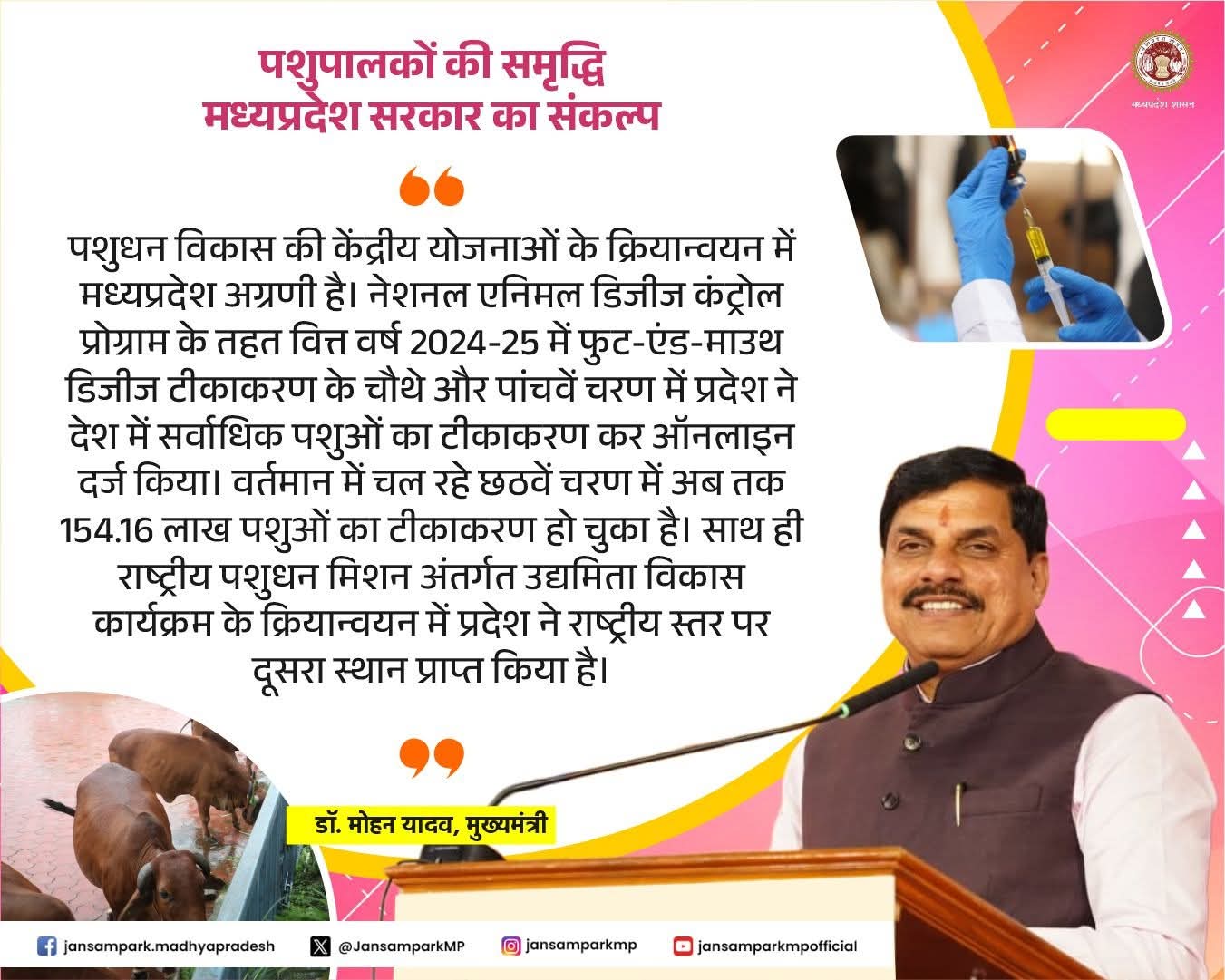 पशुधन विकास की केंद्रीय योजनाओं के क्रियान्वयन में मध्यप्रदेश अग्रणी है। नेशनल एनिमल डिजीज कंट्रोल प्रोग्राम के तहत वित्त वर्ष 2024-25 में फुट-एंड-माउथ डिजीज टीकाकरण के चौथे और पांचवें चरण में प्रदेश ने देश में सर्वाधिक पशुओं का टीकाकरण कर ऑनलाइन दर्ज किया। वर्तमान में चल रहे छठवें चरण में अब तक 154.16 लाख पशुओं का टीकाकरण हो चुका है। साथ ही राष्ट्रीय पशुधन मिशन अंतर्गत उद्यमिता विकास कार्यक्रम के क्रियान्वयन में प्रदेश ने राष्ट्रीय स्तर पर दूसरा स्थान प्राप्त किया है।