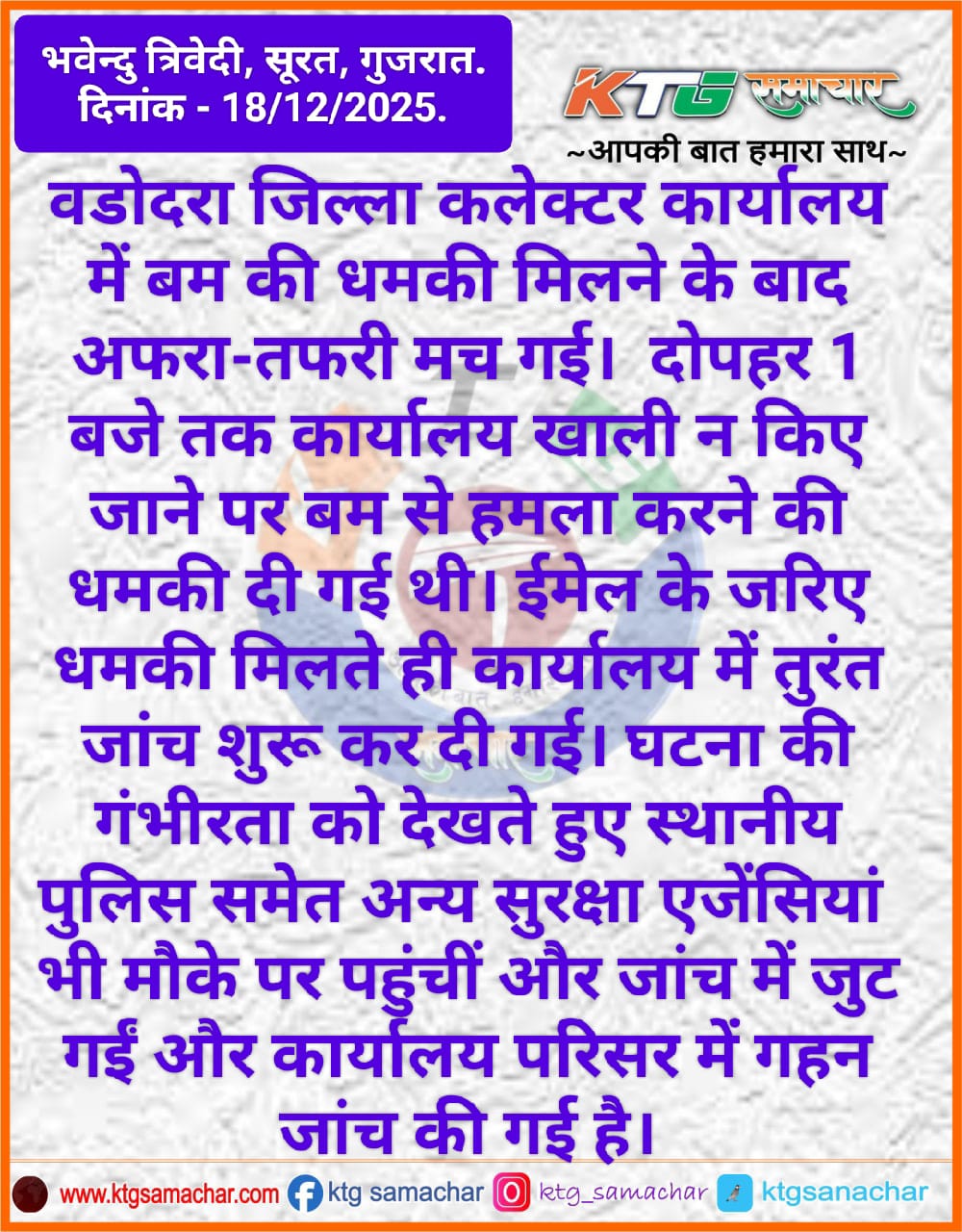 वडोदरा जिला कलेक्टर कार्यालय को ईमेल के जरिए बम से उडाने की धमकी मिली।