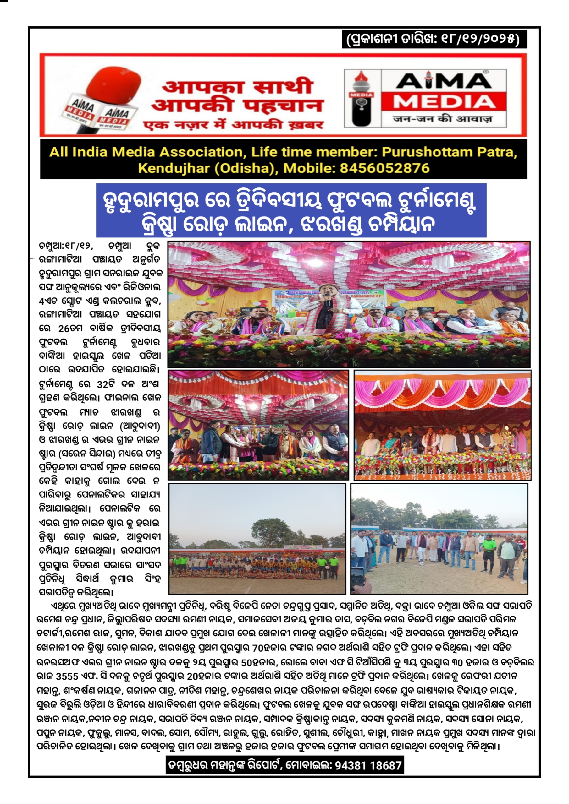 ଚମ୍ପୁଆ -18/12,ଚମ୍ପୁଆ ବ୍ଲକ ରଙ୍ଗାମାଟିଆ ପଞ୍ଚାୟତ ଅନ୍ତର୍ଗତ ହୃଦୁରାମପୁର ଗ୍ରାମ ସନରାଇଜ ଯୁବକ ସଙ୍ଘ ଆନୁକୂଲ୍ୟରେ ଏବଂ ରିଜିଓନାଲ 4ଏଚ ସ୍ପୋଟ ଏଣ୍ଡ କଲଚରାଲ କ୍ଳବ, ରଙ୍ଗାମାଟିଆ ପଞ୍ଚାୟତ ସହଯୋଗ ରେ 26ତମ ବାର୍ଷିକ ତ୍ରୀଦିବସୀୟ ଫୁଟବଲ ଟୁର୍ନାମେଣ୍ଟ ବୁଧବାର ବାଙ୍କିଆ ହାଇସ୍କୁଲ ଖେଳ ପଡିଆ ଠାରେ ଉଦଯାପିତ ହୋଇଯାଇଛି l ଟୁର୍ନାମେଣ୍ଟ ରେ 32ଟି ଦଳ ଅଂଶ ଗ୍ରହଣ କରିଥିଲେ l ଫାଇନାଲ ଖେଳ ଫୁଟବଲ ମ୍ୟାଚ ଝାରଖଣ୍ଡ ର କ୍ରିଷ୍ଣା ରୋଡ଼ ଲାଇନ (ଆବୁଦାବୀ) ଓ ଝାରଖଣ୍ଡ ର ଏଭର ଗ୍ରୀନ ନାଇନ ଷ୍ଟାର (ସରେନ ସିନ୍ଦାଇ) ମଧ୍ୟରେ ତୀବ୍ର ପ୍ରତିଦ୍ବନ୍ଦୀତା ସଂଘର୍ଷ ମୂଳକ ଖେଳରେ କେହି କାହାକୁ ଗୋଲ ଦେଇ ନ ପାରିବାରୁ ପେନାଲଟିକର ସାହାଯ୍ୟ ନିଆଯାଇଥିଲା l ପେନାଲଟିକ ରେ ଏଭର ଗ୍ରୀନ ନାଇନ ଷ୍ଟାର କୁ ହରାଇ କ୍ରିଷ୍ଣା ରୋଡ଼ ଲାଇନ, ଆବୁଦାବୀ ଚମ୍ପିୟାନ ହୋଇଥିଲା l ଉଦଯାପନୀ ପୁରସ୍କାର ବିତରଣ ସଭାରେ ସାଂସଦ ପ୍ରତିନିଧି ସିଦ୍ଧାର୍ଥ କୁମାର ସିଂହ ସଭାପତିତ୍ୱ କରିଥିଲେ l