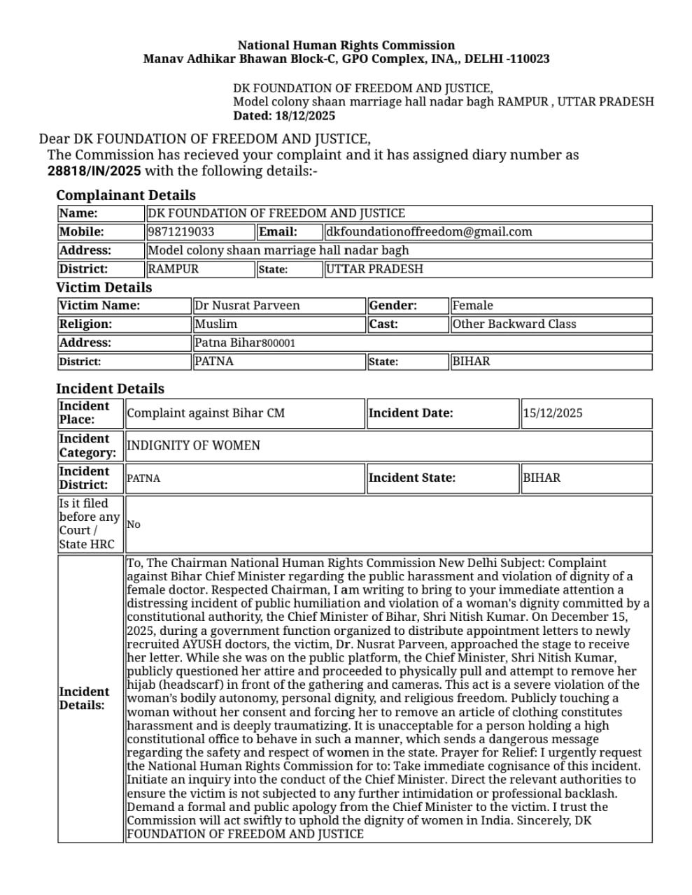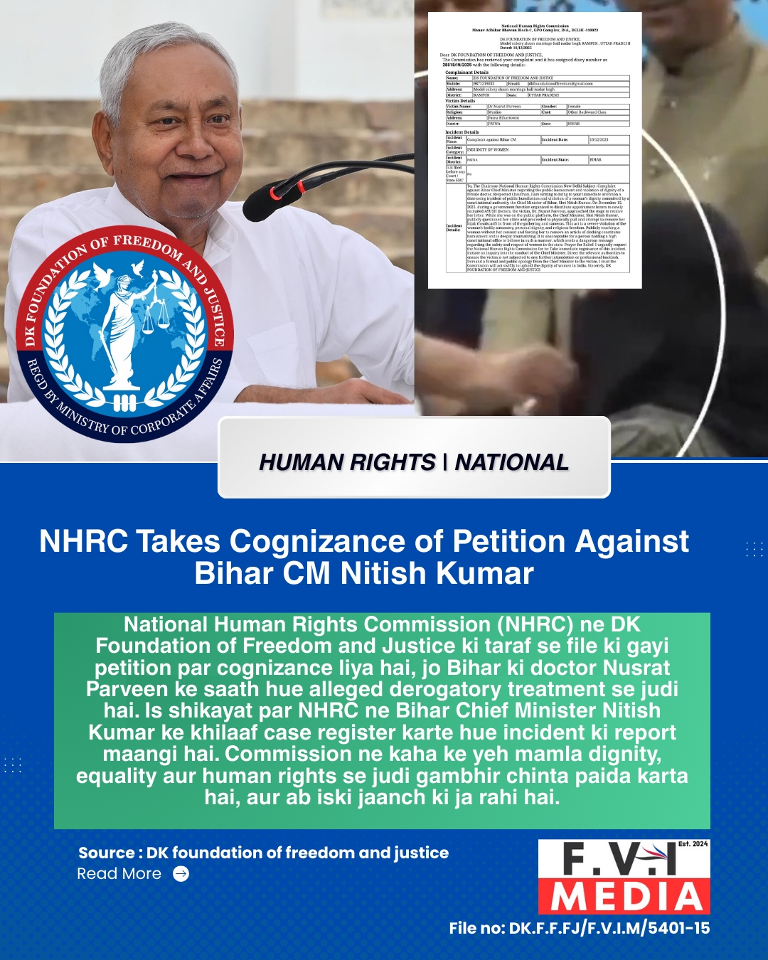 The National Human Rights Commission (NHRC) has taken cognizance of a petition filed by the DK Foundation of Freedom and Justice regarding the alleged derogatory treatment of Bihar doctor Nusrat Parveen. Acting on the complaint, the NHRC has registered a case against Bihar Chief Minister Nitish Kumar and sought details on the incident. The Commission stated that the allegations raise serious concerns related to dignity, equality, and human rights, and the matter is now under examination.