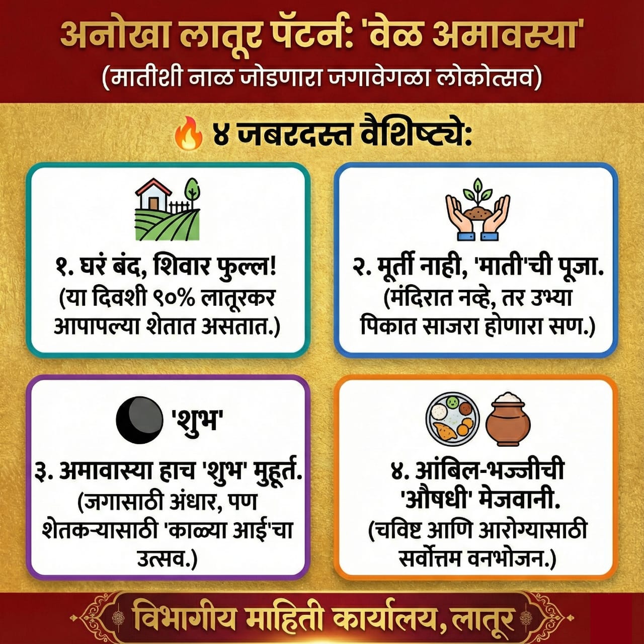 थोडक्यात सांगायचे तर, वेळ अमावस्या हा केवळ एक सण नसून निसर्गाशी कृतज्ञता व्यक्त करणारी लातूरकरांची ती एक समृद्ध अशी जगावेगळी जीवनशैली आहे.