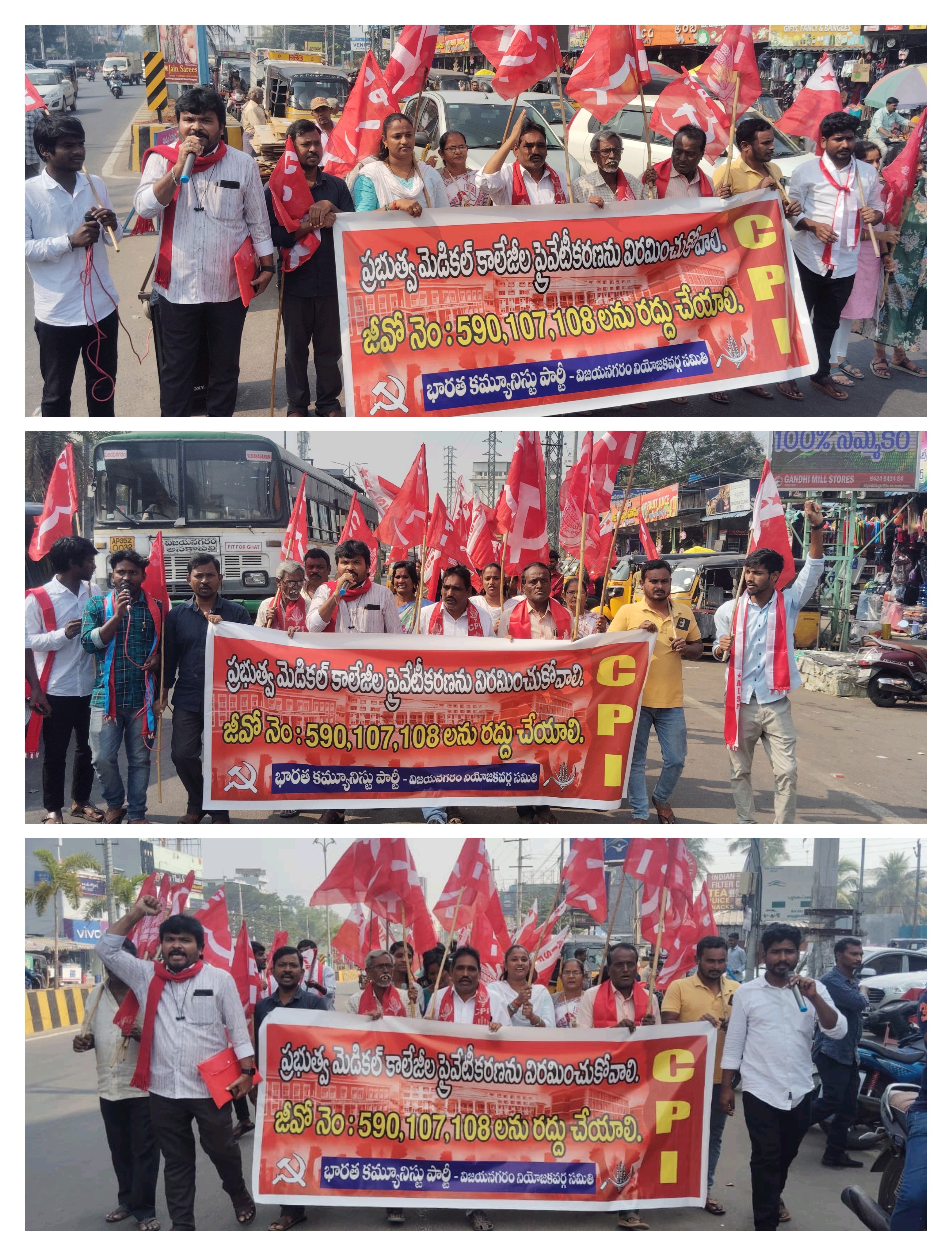 ఈ నిర్ణయానికి వ్యతిరేకంగా భారత కమ్యూనిస్టు పార్టీ ( సిపిఐ ) విజయనగరం నియోజకవర్గ సమితి ఆధ్వర్యంలో గురువారం ఉదయం 11 గంటలకు విజయనగరం స్థానిక ఆర్టీసీ కాంప్లెక్స్ వద్ద రాస్తారోకో నిరసన కార్యక్రమం చేపట్టారు.ఈ సందర్భంగా సిపిఐ జిల్లా కార్యదర్శి ఒమ్మి రమణ, జిల్లా సహాయ కార్యదర్శి బుగత అశోక్ మాట్లాడుతూ ప్రభుత్వ మెడికల్ ప్రైవేటీకరణ విధానం విద్యార్థుల హక్కులు, ఉపాధి భద్రత, పేద మధ్య తరగతి వర్గాల భవిష్యత్తుపై తీవ్రమైన ప్రతికూల ప్రభావాలు చూపుతుందని, రాజ్యాంగం లోని మౌలిక సూత్రాలకు విరుద్ధమై సామాజిక వర్గాల అభ్యున్నతికి భంగం కలిగించే చర్యగా రాష్ట్రంలోని 10 నూతన ప్రభుత్వ వైద్య కళాశాలను పిపిపి విధానంలో ప్రైవేటీకరించాలన్న ఉద్దేశంతో ప్రభుత్వం జీవో నెంబర్ 590 ని జారీ చేయడం తీవ్ర ఆందోళనకు గురి చేస్తుందని అన్నారు. గత వైసిపి ప్రభుత్వం కొత్తగా 17 వైద్య కళాశాలలు ఏర్పాటుతో రాష్ట్రంలో వైద్య సీట్ల సంఖ్య పెరుగుతుందని, వేలాదిమంది యువతకు ఉద్యోగ అవకాశాలు లభిస్తాయని ఆశించడం జరిగిందని, ఇప్పుడు కూటమి ప్రభుత్వం జీవో నెంబర్ 590 పేరుతో మెడికల్ కాలేజీలు ప్రైవేటీకరణ చేయడం దుర్మార్గమైన చర్య అని అన్నారు. ఇప్పటికైనా రాష్ట్ర ప్రభుత్వం ప్రజల అభిప్రాయాన్ని గౌరవించి జీవో నెంబర్ 590 తక్షణమే ఉపసంహరించుకోవాలని, గత ప్రభుత్వం తీసుకువచ్చిన జీవో నెంబర్ 107జీవో నెంబర్ 107, 108ను రద్దు చేయాలని, నూతన వైద్య కళాశాలలను పూర్తిగా ప్రభుత్వ ఆధీనంలోనే నిర్మించి నిర్వహించాలని, వాటిని శాశ్వత ప్రభుత్వ, ప్రజా ఆస్తులుగా నిలిపి, పేద ప్రజలు వైద్య విద్య హక్కును, సామాజిక న్యాయాన్ని భవిష్యత్తు తరాల అవకాశాలను కాపాడాలని వారు డిమాండ్ చేశారు.