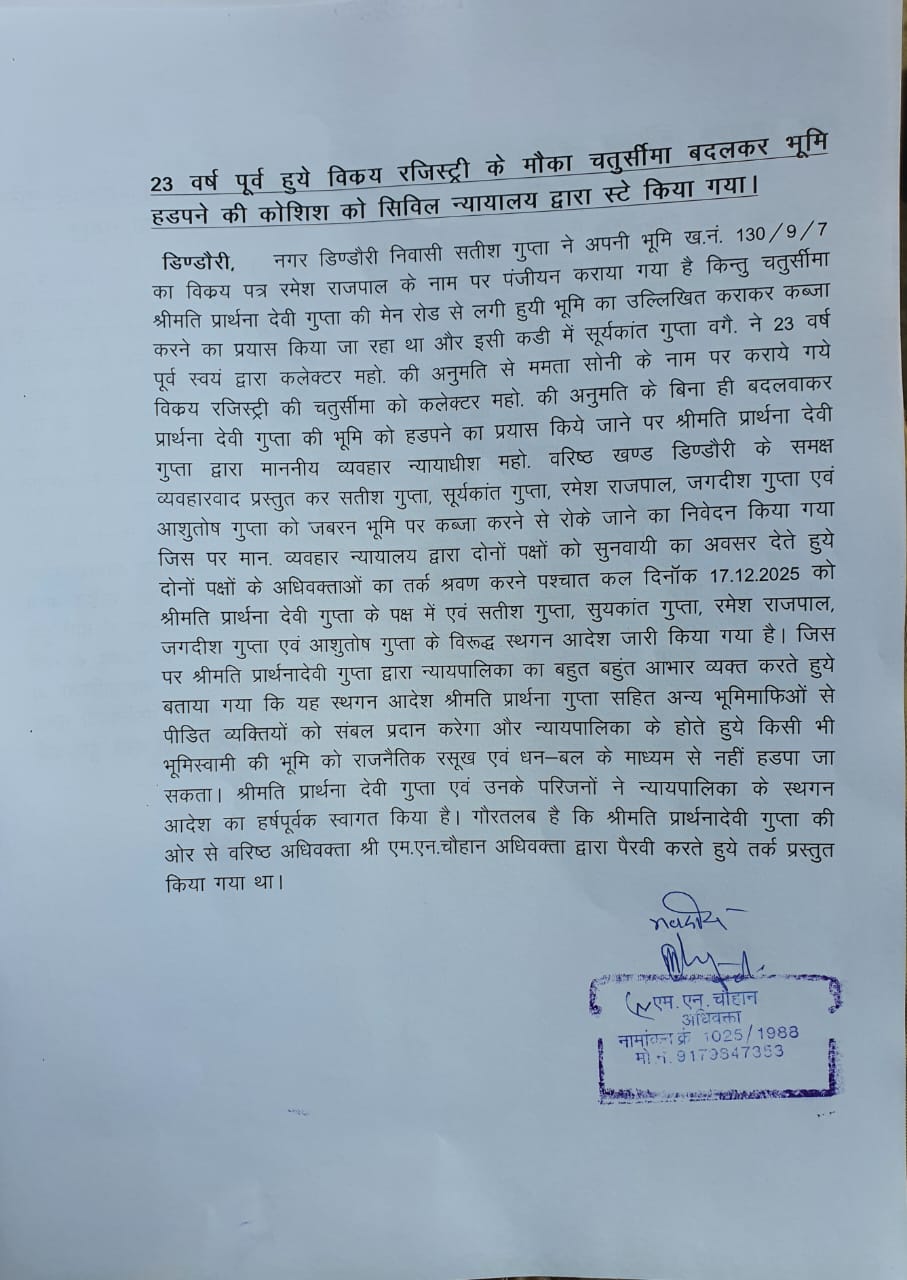 डिंडौरी शहर की बेशकीमती जमीन पर पुरानी रजिस्ट्री की चतुर्सीमा (Boundaries) बदलकर अवैध कब्जा करने के प्रयास पर माननीय व्यवहार न्यायालय ने कड़ा रुख अपनाया है। न्यायालय ने मामले की गंभीरता को देखते हुए वादी श्रीमती प्रार्थना देवी गुप्ता के पक्ष में स्थगन आदेश (Stay Order) जारी कर दिया है, जिससे भू-माफियाओं के मंसूबों पर पानी फिर गया है।