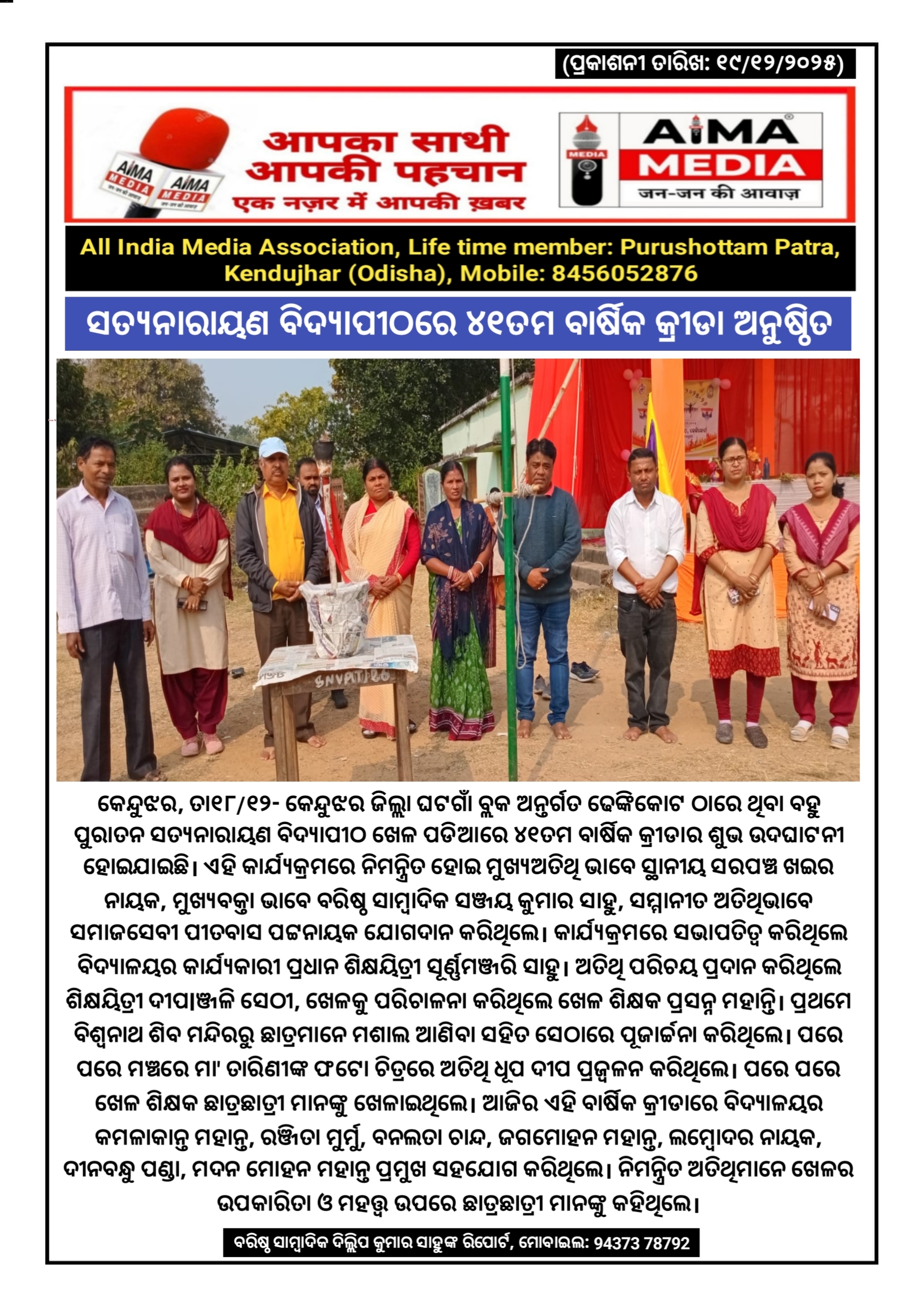 କେନ୍ଦୁଝର,ତା୧୮/୧୨- କେନ୍ଦୁଝର ଜିଲ୍ଲା ଘଟଗାଁ ବ୍ଲକ ଅନ୍ତର୍ଗତ ଢେଙ୍କିକୋଟ ଠାରେ ଥିବା ବହୁ ପୁରାତନ ସତ୍ୟନାରାୟଣ ବିଦ୍ୟାପୀଠ ଖେଳ ପଡିଆରେ ୪୧ତମ ବାର୍ଷିକ କ୍ରୀଡାର ଶୁଭ ଉଦଘାଟନୀ ହୋଇଯାଇଛି। ଏହି କାର୍ଯ୍ୟକ୍ରମରେ ନିମନ୍ତ୍ରିତ ହୋଇ ମୁଖ୍ୟଅତିଥି ଭାବେ ସ୍ଥାନୀୟ ସରପଞ୍ଚ ଖଇର ନାୟକ, ମୁଖ୍ୟବକ୍ତା ଭାବେ ବରିଷ୍ଠ ସାମ୍ବାଦିକ ସଞ୍ଜୟ କୁମାର ସାହୁ, ସମ୍ମାନୀତ ଅତିଥିଭାବେ ସମାଜସେବୀ ପୀତବାସ ପଟ୍ଟନାୟକ ଯୋଗଦାନ କରିଥିଲେ। କାର୍ଯ୍ୟକ୍ରମରେ ସଭାପତିତ୍ଵ କରିଥିଲେ ବିଦ୍ୟାଳୟର କାର୍ଯ୍ୟକାରୀ ପ୍ରଧାନ ଶିକ୍ଷୟିତ୍ରୀ ସୂର୍ଣ୍ଣମଞ୍ଜରି ସାହୁ। ଅତିଥି ପରିଚୟ ପ୍ରଦାନ କରିଥିଲେ ଶିକ୍ଷୟିତ୍ରୀ ଦୀପlଞ୍ଜଳି ସେଠୀ, ଖେଳକୁ ପରିଚାଳନା କରିଥିଲେ ଖେଳ ଶିକ୍ଷକ ପ୍ରସନ୍ନ ମହାନ୍ତି। ପ୍ରଥମେ ବିଶ୍ଵନାଥ ଶିବ ମନ୍ଦିରରୁ ଛାତ୍ରମାନେ ମଶାଲ ଆଣିବା ସହିତ ସେଠାରେ ପୂଜାର୍ଚ୍ଚନା କରିଥିଲେ। ପରେ ପରେ ମଞ୍ଚରେ ମା' ତାରିଣୀଙ୍କ ଫଟୋ ଚିତ୍ରରେ ଅତିଥି ଧୂପ ଦୀପ ପ୍ରଜ୍ବଳନ କରିଥିଲେ। ପରେ ପରେ ଖେଳ ଶିକ୍ଷକ ଛାତ୍ରଛାତ୍ରୀ ମାନଙ୍କୁ ଖେଳାଇଥିଲେ। ଆଜିର ଏହି ବାର୍ଷିକ କ୍ରୀଡାରେ ବିଦ୍ୟାଳୟର କମଳାକାନ୍ତ ମହାନ୍ତ,ରଞ୍ଜିତା ମୁର୍ମୁ, ବନଲତା ଚାନ୍ଦ,ଜଗମୋହନ ମହାନ୍ତ,ଲମ୍ବୋଦର ନାୟକ, ଦୀନବନ୍ଧୁ ପଣ୍ଡା,ମଦନ ମୋହନ ମହାନ୍ତ ପ୍ରମୁଖ ସହଯୋଗ କରିଥିଲେ। ନିମନ୍ତ୍ରିତ ଅତିଥିମାନେ ଖେଳର ଉପକାରିତା ଓ ମହତ୍ତ୍ଵ ଉପରେ ଛାତ୍ରଛାତ୍ରୀ ମାନଙ୍କୁ କହିଥିଲେ।