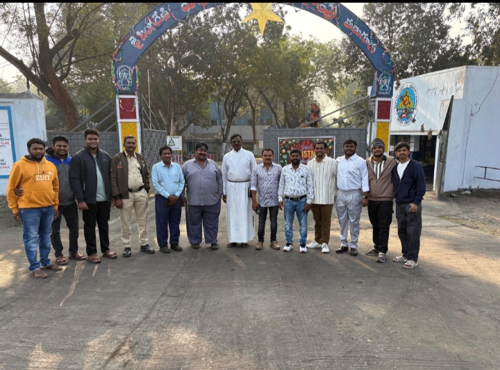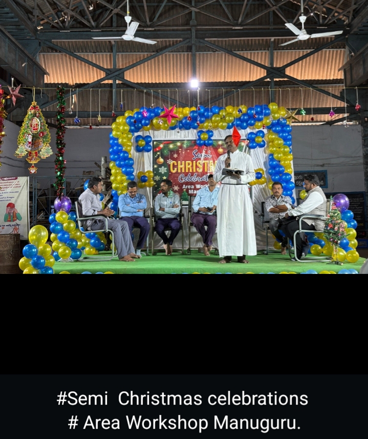 Celebrating semi christmas at bhadari kothagudam district manuguru mandal sccl area workshop.for this program pastors,youth,all employees are take part in this program.pastor said few words about Jesus after completing pastor message cake cutting and cake was giving to all members who are attend this program