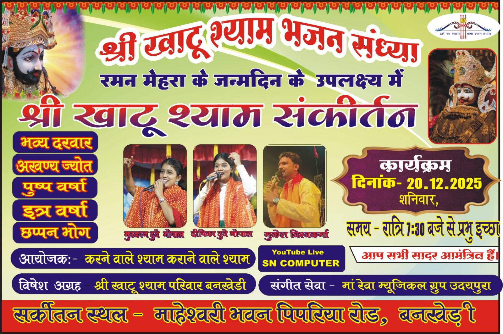 बनखेड़ी--श्री खाटू श्याम भजन संध्या का आयोजन आज 20 दिसंबर 20 25 को शाम 7:30 बजे से रमन मेहरा (मेहरा भारत पेट्रोलियम चादौन)के जन्मदिन के उपलक्ष में महेश्वरी भवन पिपरिया रोड बनखेड़ी में रखा गया है श्री खाटू श्याम संकीर्तन सहित भव्य दरबार अखंड ज्योत पुष्प वर्षा इत्र वर्षा छप्पन भोग का आयोजन रखा है जिसमें खाटू श्याम के भजन गायक गायिका में मुस्कान दुबे भोपाल दीपिका दुबे भोपाल मुकेश विश्वकर्मा भोपाल जिसमें संगीत सेवा मां रेवा म्यूजिकल ग्रुप उदयपुरा देगा कार्यक्रम का आयोजन श्री खाटू श्याम परिवार ने समस्त खाटू श्याम धर्म प्रेमियों सहित नगर वासियों से अपील की है कि कार्यक्रम में पधारकर पुण्य लाभ प्राप्त करें
