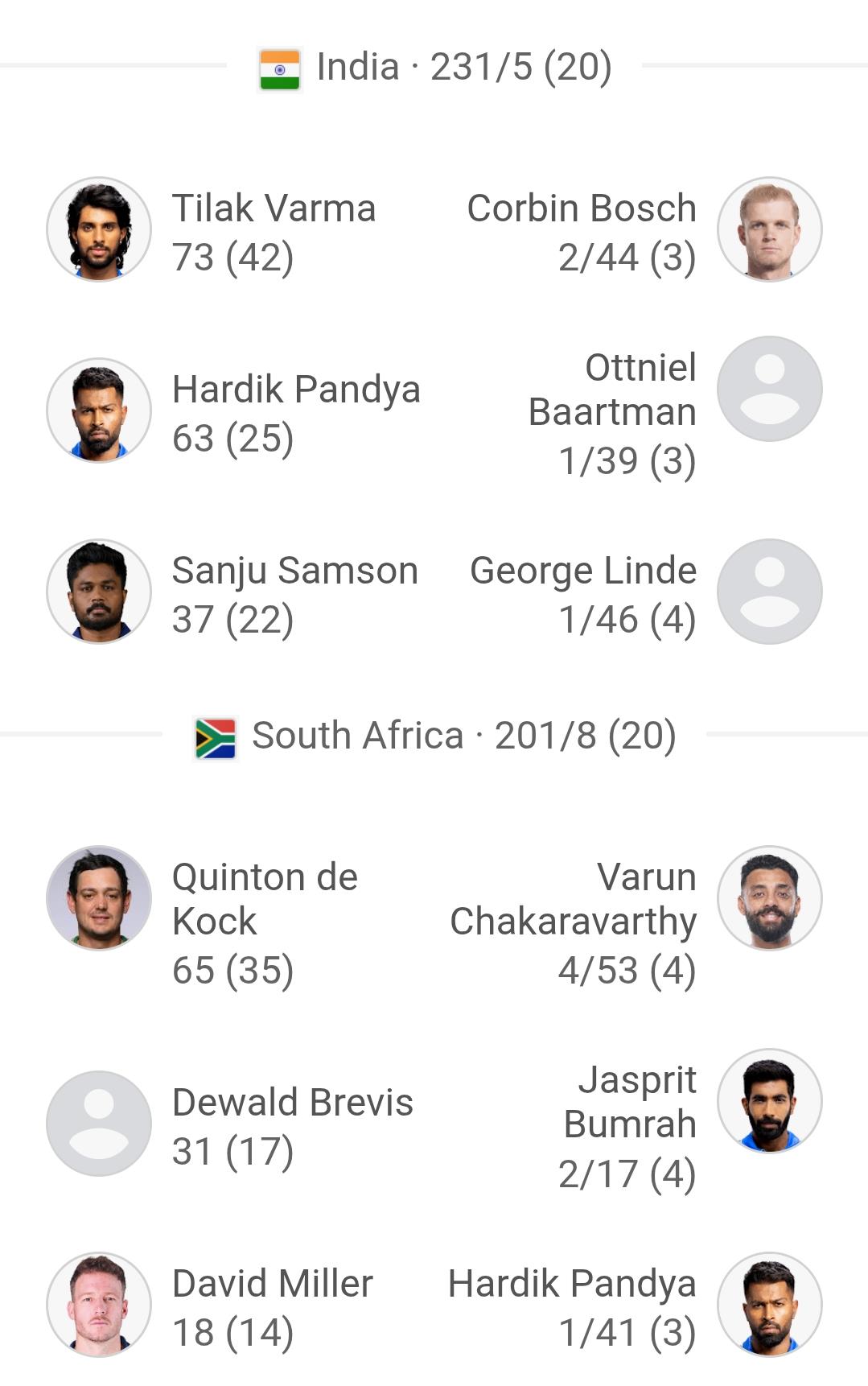 Batting first, India unleashed a batting blitzkrieg, piling up a colossal 231/5, leaving the Proteas shell-shocked. The carnage was led by Tilak Varma’s classy yet brutal half-century, while allrounder Hardik Pandya set the stadium ablaze, smashing a breathtaking fifty off just 16 balls, the second-fastest T20I half-century by an Indian. The Indian innings was a perfect blend of power and precision, turning the contest into an uphill battle for the visitors.