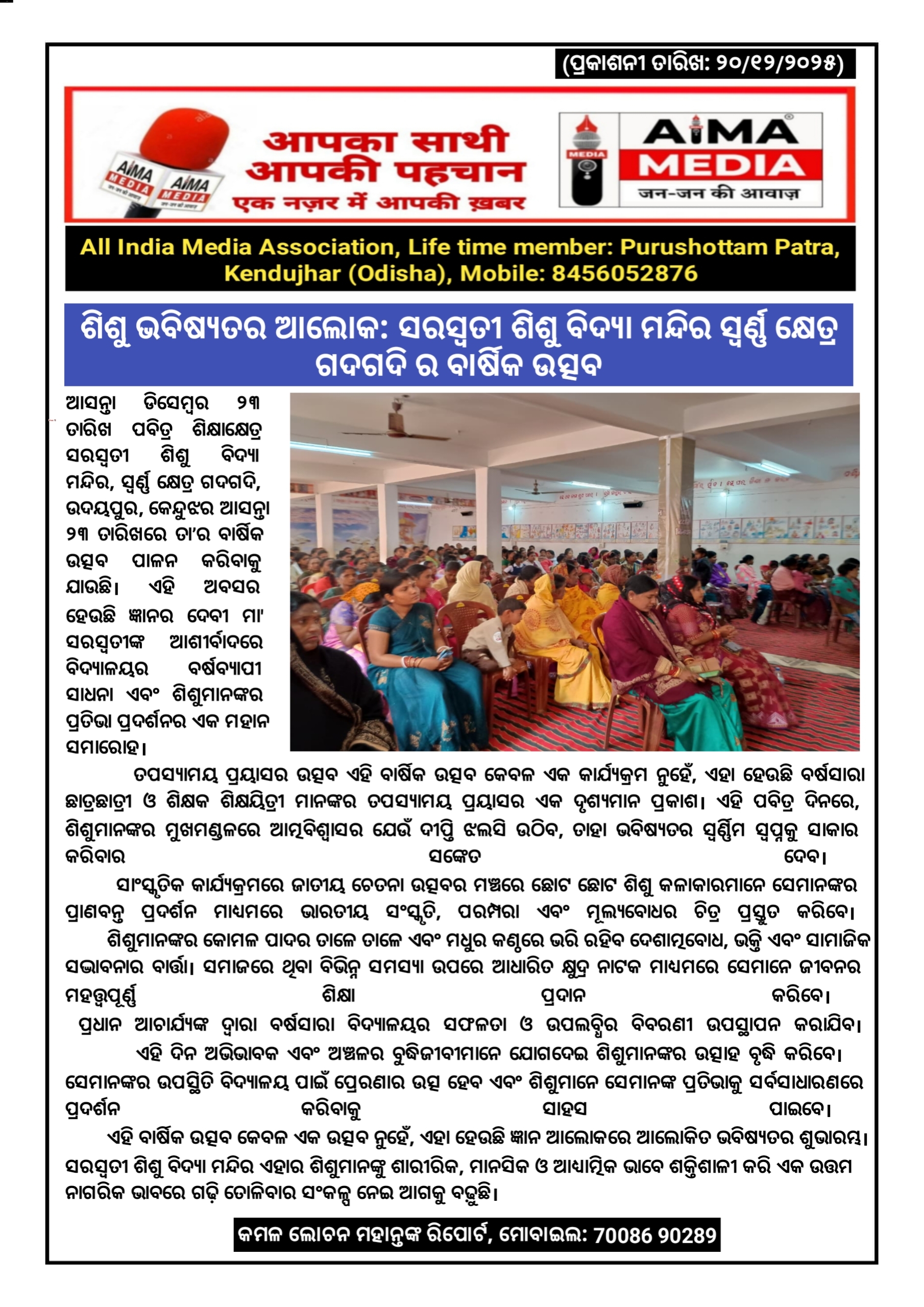 ​ପବିତ୍ର ଶିକ୍ଷାକ୍ଷେତ୍ର ସରସ୍ୱତୀ ଶିଶୁ ବିଦ୍ୟା ମନ୍ଦିର, ସ୍ୱର୍ଣ୍ଣ କ୍ଷେତ୍ର ଗଦଗଦି, ଉଦୟପୁର, କେନ୍ଦୁଝର ଆସନ୍ତା ୨୩ ତାରିଖରେ ତା’ର ବାର୍ଷିକ ଉତ୍ସବ ପାଳନ କରିବାକୁ ଯାଉଛି। ଏହି ଅବସର ହେଉଛି ଜ୍ଞାନର ଦେବୀ ମା' ସରସ୍ୱତୀଙ୍କ ଆଶୀର୍ବାଦରେ ବିଦ୍ୟାଳୟର ବର୍ଷବ୍ୟାପୀ ସାଧନା ଏବଂ ଶିଶୁମାନଙ୍କର ପ୍ରତିଭା ପ୍ରଦର୍ଶନର ଏକ ମହାନ ସମାରୋହ।