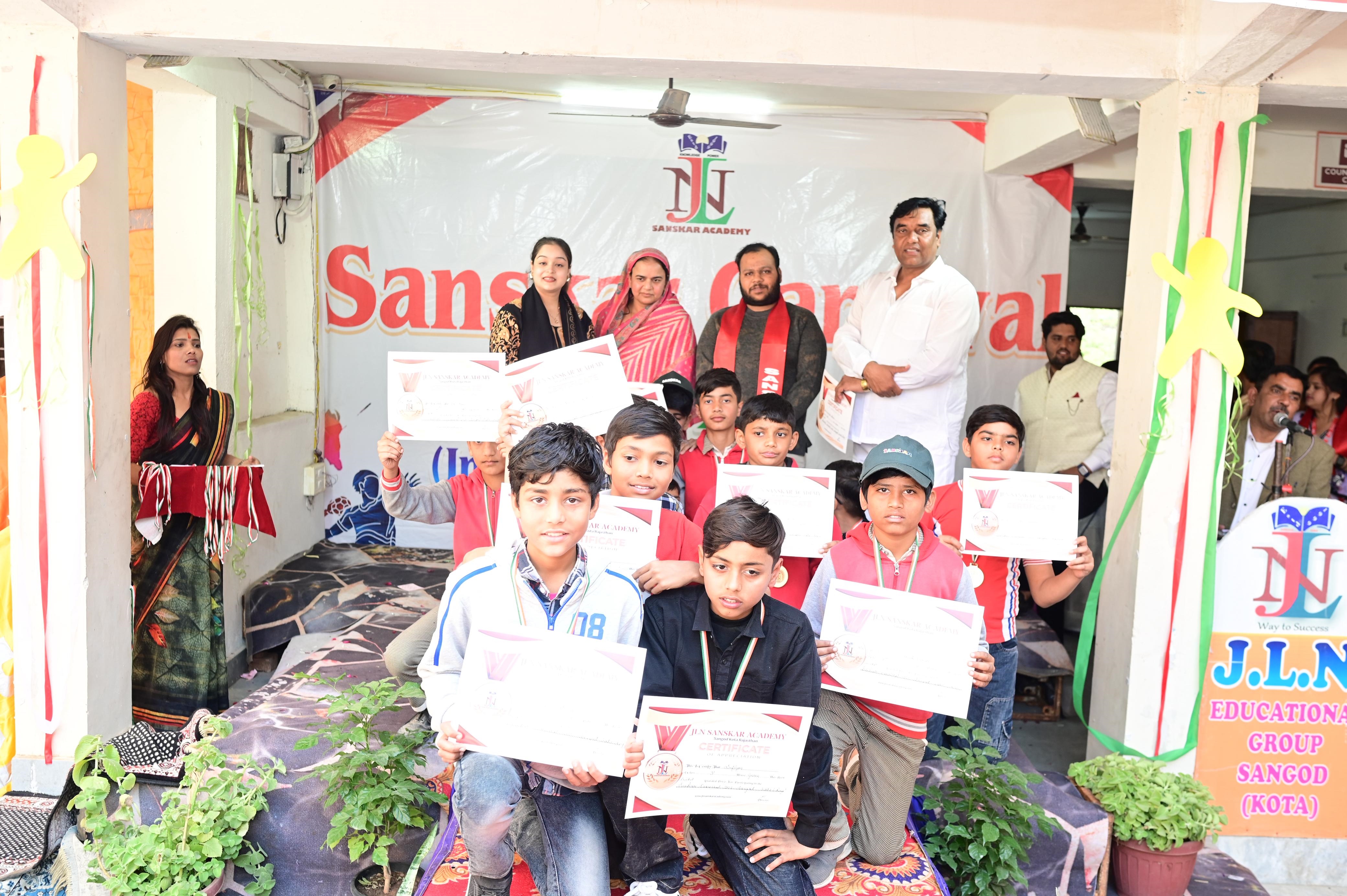 सांगोद-नगर में स्थित संस्कार एकेडमी में आयोजित संस्कार कार्निवल 2025 का समापन हुआ। इस अवसर पर 500 से अधिक विद्यार्थियों को सम्मानित किया गया।नन्हे बच्चों ने रंगारंग सांस्कृतिक कार्यक्रम प्रस्तुत किए।फैंसी ड्रेस प्रतियोगिता में बच्चों ने डॉक्टर, पुलिस इंस्पेक्टर, इंजीनियर और सैनिक के रूप में अपनी प्रतिभा दिखाई।खेल प्रतियोगिताएँ, सांस्कृतिक कार्यक्रम और रचनात्मक गतिविधियाँ आयोजित की गईं।