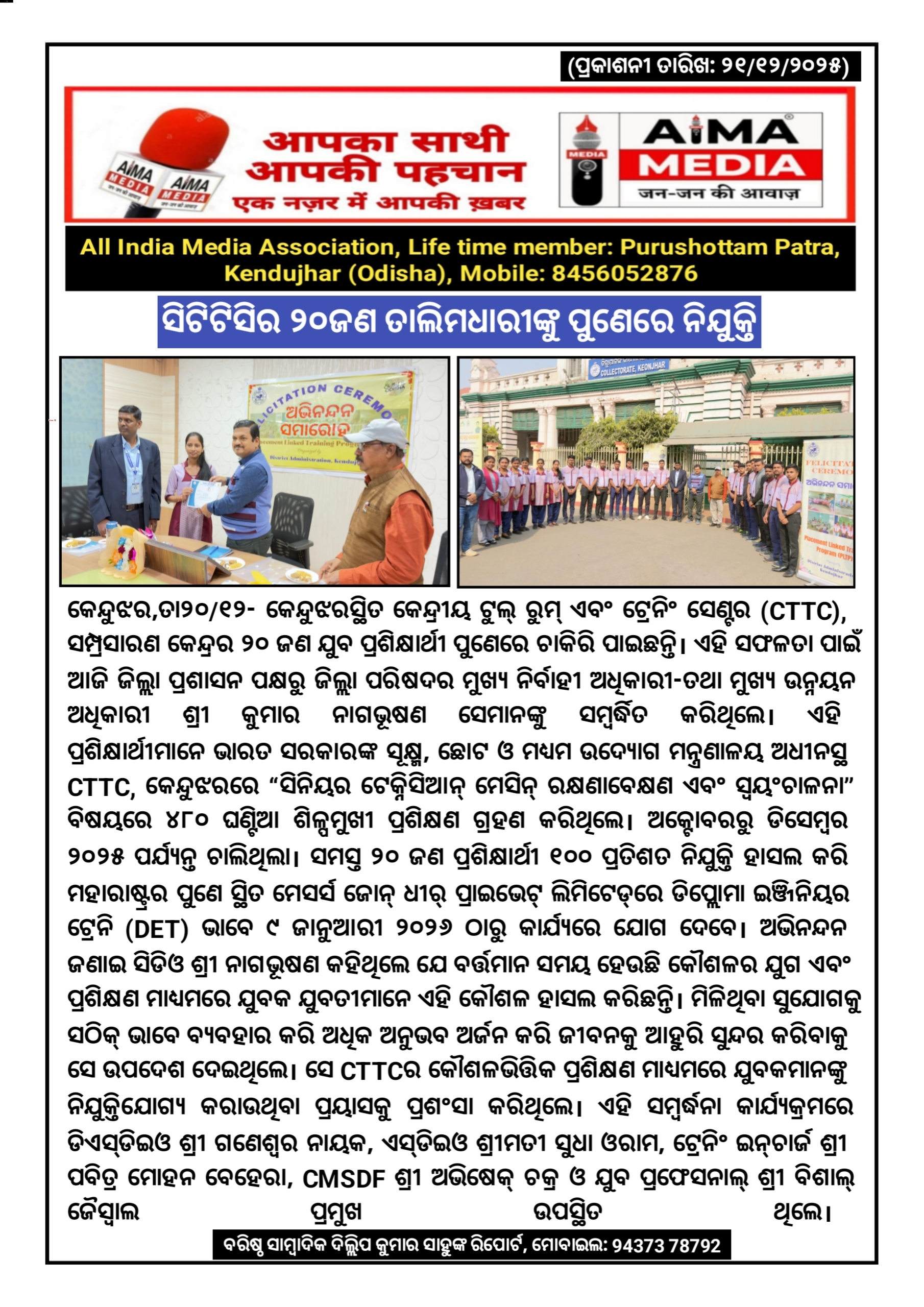 କେନ୍ଦୁଝର,ତା୨୦/୧୨- କେନ୍ଦୁଝରସ୍ଥିତ କେନ୍ଦ୍ରୀୟ ଟୁଲ୍ ରୁମ୍ ଏବଂ ଟ୍ରେନିଂ ସେଣ୍ଟର (CTTC), ସମ୍ପ୍ରସାରଣ କେନ୍ଦ୍ରର ୨୦ ଜଣ ଯୁବ ପ୍ରଶିକ୍ଷାର୍ଥୀ ପୁଣେରେ ଚାକିରି ପାଇଛନ୍ତି। ଏହି ସଫଳତା ପାଇଁ ଆଜି ଜିଲ୍ଲା ପ୍ରଶାସନ ପକ୍ଷରୁ ଜିଲ୍ଲା ପରିଷଦର ମୁଖ୍ୟ ନିର୍ବାହୀ ଅଧିକାରୀ-ତଥା ମୁଖ୍ୟ ଉନ୍ନୟନ ଅଧିକାରୀ ଶ୍ରୀ କୁମାର ନାଗଭୂଷଣ ସେମାନଙ୍କୁ ସମ୍ବର୍ଦ୍ଧିତ କରିଥିଲେ। ଏହି ପ୍ରଶିକ୍ଷାର୍ଥୀମାନେ ଭାରତ ସରକାରଙ୍କ ସୂକ୍ଷ୍ମ, ଛୋଟ ଓ ମଧ୍ୟମ ଉଦ୍ୟୋଗ ମନ୍ତ୍ରଣାଳୟ ଅଧୀନସ୍ଥ CTTC, କେନ୍ଦୁଝରରେ “ସିନିୟର ଟେକ୍ନିସିଆନ୍ ମେସିନ୍ ରକ୍ଷଣାବେକ୍ଷଣ ଏବଂ ସ୍ଵୟଂଚାଳନା” ବିଷୟରେ ୪୮୦ ଘଣ୍ଟିଆ ଶିଳ୍ପମୁଖୀ ପ୍ରଶିକ୍ଷଣ ଗ୍ରହଣ କରିଥିଲେ। ଅକ୍ଟୋବରରୁ ଡିସେମ୍ବର ୨୦୨୫ ପର୍ଯ୍ୟନ୍ତ ଚାଲିଥିଲା। ସମସ୍ତ ୨୦ ଜଣ ପ୍ରଶିକ୍ଷାର୍ଥୀ ୧୦୦ ପ୍ରତିଶତ ନିଯୁକ୍ତି ହାସଲ କରି ମହାରାଷ୍ଟ୍ରର ପୁଣେ ସ୍ଥିତ ମେସର୍ସ ଜୋନ୍ ଧୀର୍ ପ୍ରାଇଭେଟ୍ ଲିମିଟେଡ୍‌ରେ ଡିପ୍ଲୋମା ଇଞ୍ଜିନିୟର ଟ୍ରେନି (DET) ଭାବେ ୯ ଜାନୁଆରୀ ୨୦୨୬ ଠାରୁ କାର୍ଯ୍ୟରେ ଯୋଗ ଦେବେ। ଅଭିନନ୍ଦନ ଜଣାଇ ସିଡିଓ ଶ୍ରୀ ନାଗଭୂଷଣ କହିଥିଲେ ଯେ ବର୍ତ୍ତମାନ ସମୟ ହେଉଛି କୌଶଳର ଯୁଗ ଏବଂ ପ୍ରଶିକ୍ଷଣ ମାଧ୍ୟମରେ ଯୁବକ ଯୁବତୀମାନେ ଏହି କୌଶଳ ହାସଲ କରିଛନ୍ତି। ମିଳିଥିବା ସୁଯୋଗକୁ ସଠିକ୍ ଭାବେ ବ୍ୟବହାର କରି ଅଧିକ ଅନୁଭବ ଅର୍ଜନ କରି ଜୀବନକୁ ଆହୁରି ସୁନ୍ଦର କରିବାକୁ ସେ ଉପଦେଶ ଦେଇଥିଲେ। ସେ CTTCର କୌଶଳଭିତ୍ତିକ ପ୍ରଶିକ୍ଷଣ ମାଧ୍ୟମରେ ଯୁବକମାନଙ୍କୁ ନିଯୁକ୍ତିଯୋଗ୍ୟ କରାଉଥିବା ପ୍ରୟାସକୁ ପ୍ରଶଂସା କରିଥିଲେ। ଏହି ସମ୍ବର୍ଦ୍ଧନା କାର୍ଯ୍ୟକ୍ରମରେ ଡିଏସ୍‌ଡିଇଓ ଶ୍ରୀ ଗଣେଶ୍ୱର ନାୟକ, ଏସ୍‌ଡିଇଓ ଶ୍ରୀମତୀ ସୁଧା ଓରାମ, ଟ୍ରେନିଂ ଇନ୍‌ଚାର୍ଜ ଶ୍ରୀ ପବିତ୍ର ମୋହନ ବେହେରା, CMSDF ଶ୍ରୀ ଅଭିଷେକ୍ ଚକ୍ର ଓ ଯୁବ ପ୍ରଫେସନାଲ୍ ଶ୍ରୀ ବିଶାଲ୍ ଜୈସ୍ୱାଲ ପ୍ରମୁଖ ଉପସ୍ଥିତ ଥିଲେ।