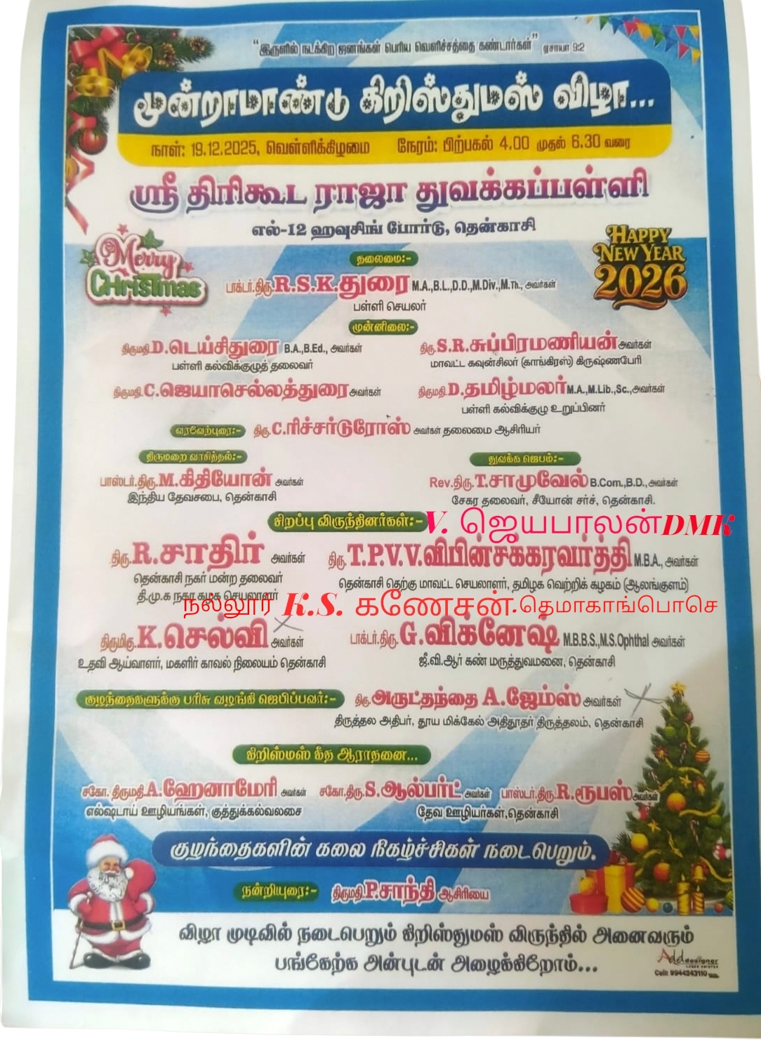 19/12/2025 அன்று தென்காசி மாவட்டம் ஹவுசிங் போர்டு அருகில் ஸ்ரீ திரிகூட ராஜா துவக்கப்பள்ளியில் படிக்கும் மாணவர்களுடன் கிறிஸ்துமஸ் பெருவிழா கொண்டாடப்பட்டது .இந்த விழாவில் முன்னாள் தமிழ்நாடு காங்கிரஸ் கமிட்டி கொள்கை பரப்பு செயலாளர் R.S.K.துரை தலைமையில்,பள்ளி கல்வி குழு தலைவர் திருமதி D. டெய்சிதுரை, முன்னிலையில்,C ரிச்சர்டுரோஸ் பள்ளி தலைமை ஆசிரியர் வரவேற்புரையுடன் ,திமுக செயலாளர் வே.ஜெயபாலன், திமுக நகர செயலாளர் R. சாதிர் ஆகியோர் பள்ளி குழந்தைகளுடன் கிறிஸ்துமஸ் கேக் வெட்டியும் மாணவர்களுக்கு சிறப்பு பரிசுகள் டிபன் பாக்ஸ், சில்வர் தட்டுகளும்,பெரியோர்களுக்கு வேஷ்டி, சேலையும்,தென்காசி தெற்கு மாவட்ட செயலாளர் தமிழக வெற்றி கழகம் T.P.V.V.வி பின் சக்கரவர்த்தி,தென்காசி மாவட்ட காங்கிரஸ் பொதுச் செயலாளர் தமிழ்நாடு ராஜீவ் காந்தி சமூக சேவை அறக்கட்டளையின் ஒருங்கிணைந்த மாவட்ட தலைவரும் நல்லூர் நாயகன் K.S.கணேசன், திருச்சபையின் போதகர் M.கிதியோன் மற்றும் T.சாமுவேல் ஆகியோரின் ஜெபத்துடன் அனைவருக்கும் பைபிள் வழங்கினார்கள்.600 பேருக்கு இரவு உணவு பரிமாறப்பட்டது.மற்றும் தமிழ்நாடு ராஜீவ் காந்தி சமூக சேவை அறக்கட்டளையின் நிர்வாகிகளுடன் ஆசிரியர்களும், பொதுமக்களும் கலந்து கொண்டனர்.ஆசிரியை P.சாந்தியின் நன்றியுரையுடன் கிறிஸ்துமஸ் விழா இனிதே நிறைவு பெற்றது.