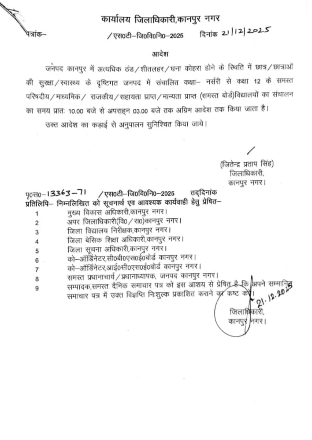 *जिलाधिकारी ने बढ़ती ठंड और कोहरे के चलते स्कूलों के समय में किया बदलाव।*