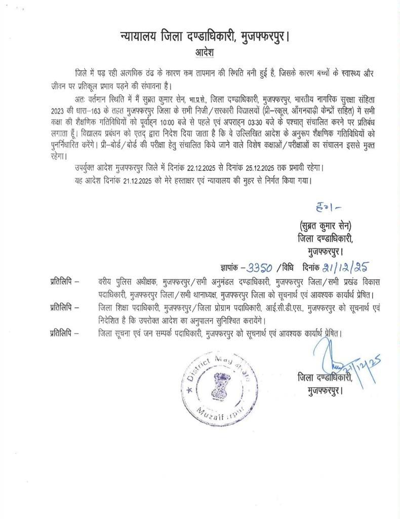 जिलाधिकारी के आदेश के अनुसार, मुजफ्फरपुर के सभी सरकारी एवं निजी विद्यालयों में किसी भी कक्षा की पढ़ाई पूर्वाह्न 10:00 बजे से पहले तथा अपराह्न 3:30 बजे के बाद संचालित नहीं की जाएगी। यह आदेश छात्रों के स्वास्थ्य और सुरक्षा को ध्यान में रखते हुए जारी किया गया है।