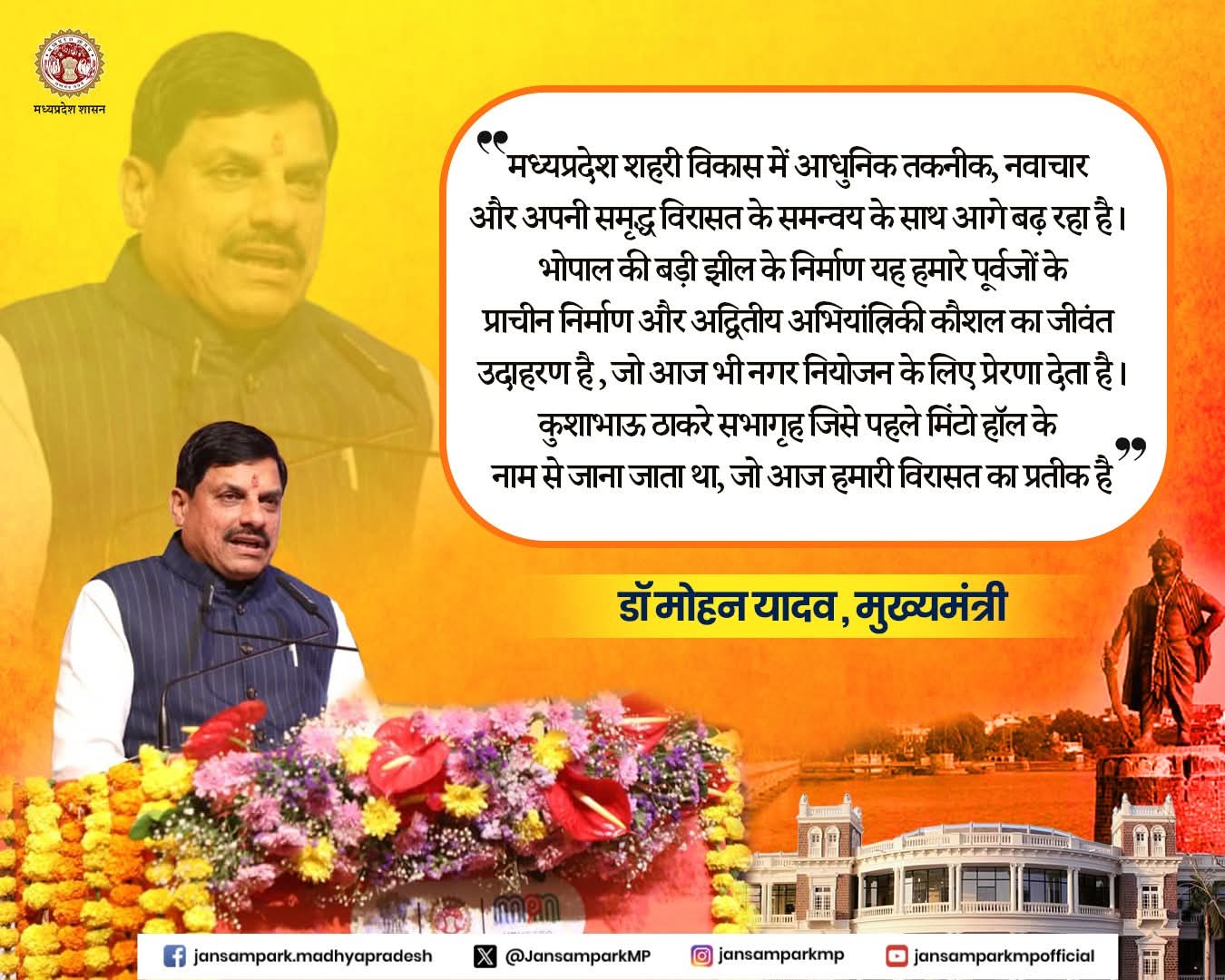 मध्यप्रदेश शहरी विकास में आधुनिक तकनीक,नवाचार और अपनी समृद्ध विरासत के समन्वय के साथ आगे बढ़ रहा है। भोपाल की बड़ी झील के निर्माण यह हमारे पूर्वजों के प्राचीन निर्माण और अद्वितीय अभियांत्रिकी कौशल का जीवंत उदाहरण है, जो आज भी नगर नियोजन के लिए प्रेरणा देता है। कुशाभाऊ ठाकरे सभागृह,जिसे पहले मिंटो हॉल के नाम से जाना जाता था,जो आज हमारी विरासत का प्रतीक है