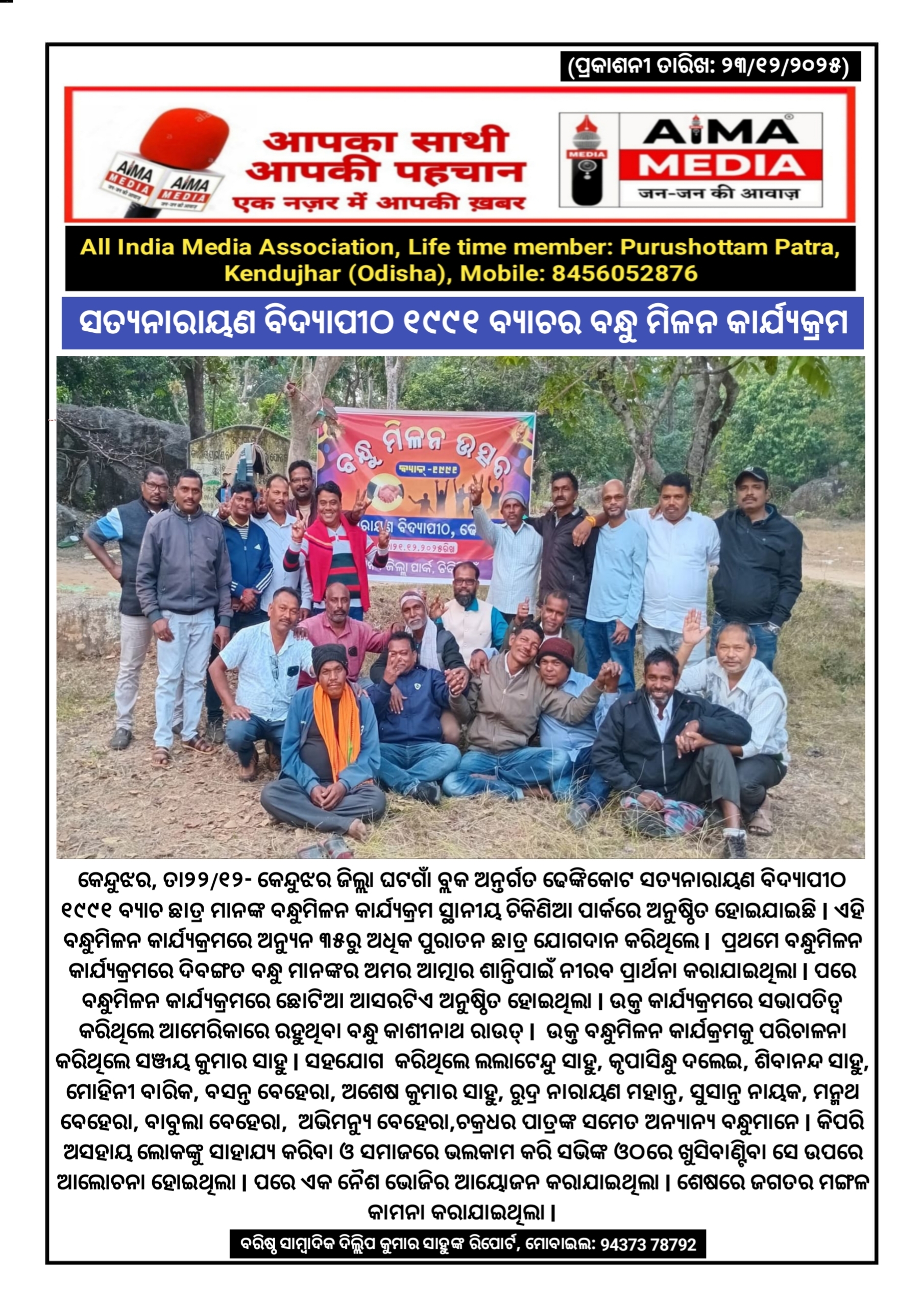 ସତ୍ୟନାରାୟଣ ବିଦ୍ୟାପୀଠ ୧୯୯୧ ବ୍ୟାଚର ବନ୍ଧୁ ମିଳନ କାର୍ଯ୍ୟକ୍ରମ।