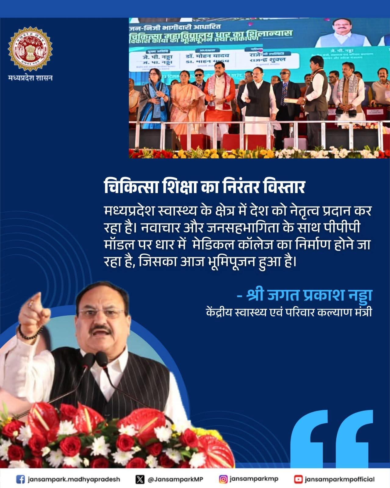 मध्यप्रदेश स्वास्थ्य के क्षेत्र में देश को नेतृत्व प्रदान कर रहा है। नवाचार और जनसहभागिता के साथ पीपीपी मॉडल पर धार में मेडिकल कॉलेज का निर्माण होने जा रहा है, जिसका आज भूमिपूजन हुआ है।
