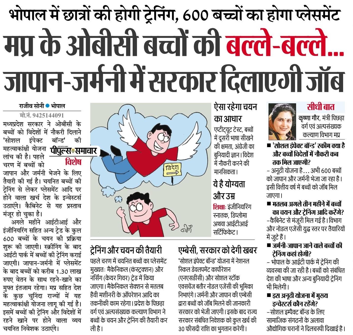 भोपाल में ओबीसी छात्रों की होगी ट्रेनिंग,600 बच्चों का होगा प्लेसमेंट जापान जर्मनी में सरकार दिलाएगी जाॅब