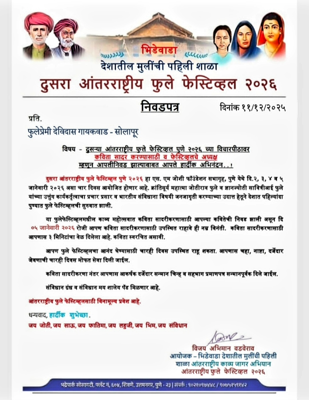 वर्ण व्यवस्थेवर आपल्या प्रखर विचाराने घणघाती हल्ला करणारे पहिले सामाजिक बंडखोर , क्रांतिसुर्य महात्मा ज्योतिराव फुले , क्रांतिज्योती सावित्रीमाई फुले , फातिमा शेख , ज्यांनी भारतिय संविधानतुन प्रत्येक स्री - पुरुषांना समतेचे व मानवतेचे सर्व अधिकार बहाल केले असे विश्वविख्यात, बुद्धिसम्राट, विश्वरत्न - डाॅ.बाबासाहेब आंबेडकर , आरक्षणाचे जनक राजर्षी छत्रपती शाहू महाराज ,यां महापुरुषांच्या महान विचारांचा प्रसार ,प्रचार ,व जागर व्हावा यासाठी पुण्यामध्ये दुसरे अंतरराष्ट्रिय फुले फेस्टिव्हल २०२६ चे आयोजन करण्यात आले आहे.. महापुरुषांच्या विचाराने प्रेरित असलेले प्रसिद्ध कवी / शिक्षक व संविधान दुत- सन्मा , विजय वडवेराव सर यानी या फेस्टिवलचे भव्य दिव्य असे आयोजन केले आहे..