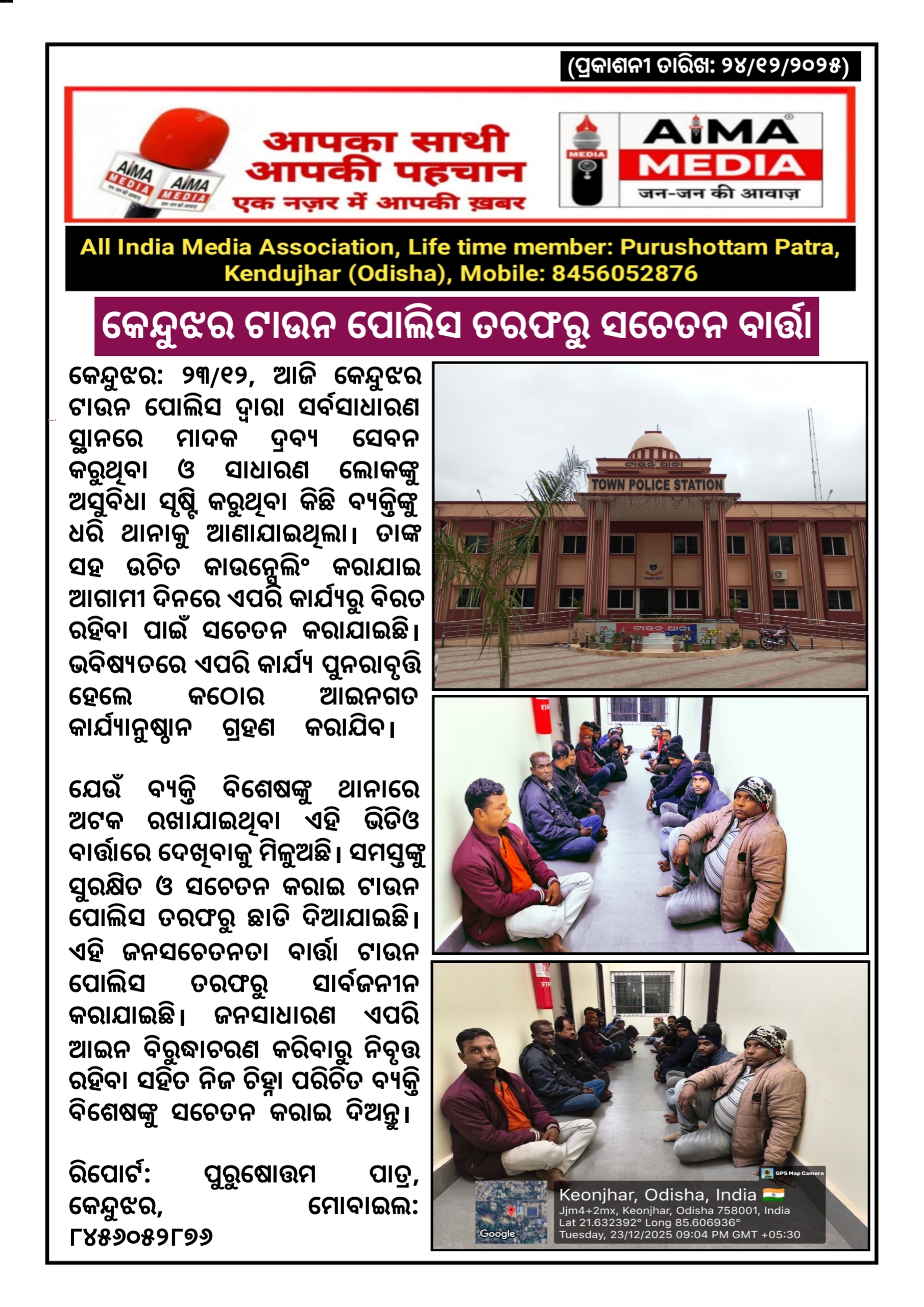 କେନ୍ଦୁଝର ଟାଉନ ପୋଲିସ ତରଫରୁ ସଚେତନ ବାର୍ତ୍ତା। --------------------------------------------କେନ୍ଦୁଝର: ୨୩/୧୨, ଆଜି କେନ୍ଦୁଝର ଟାଉନ ପୋଲିସ ଦ୍ୱାରା ସର୍ବସାଧାରଣ ସ୍ଥାନରେ ମାଦକ ଦ୍ରବ୍ୟ ସେବନ କରୁଥିବା ଓ ସାଧାରଣ ଲୋକଙ୍କୁ ଅସୁବିଧା ସୃଷ୍ଟି କରୁଥିବା କିଛି ବ୍ୟକ୍ତିଙ୍କୁ ଧରି ଥାନାକୁ ଆଣାଯାଇଥିଲା। ତାଙ୍କ ସହ ଉଚିତ କାଉନ୍ସେଲିଂ କରାଯାଇ ଆଗାମୀ ଦିନରେ ଏପରି କାର୍ଯ୍ୟରୁ ବିରତ ରହିବା ପାଇଁ ସଚେତନ କରାଯାଇଛି। ଭବିଷ୍ୟତରେ ଏପରି କାର୍ଯ୍ୟ ପୁନରାବୃତ୍ତି ହେଲେ କଠୋର ଆଇନଗତ କାର୍ଯ୍ୟାନୁଷ୍ଠାନ ଗ୍ରହଣ କରାଯିବ। ଯେଉଁ ବ୍ଯକ୍ତି ବିଶେଷଙ୍କୁ ଥାନାରେ ଅଟକ ରଖାଯାଇଥିବା ଏହି ଭିଡିଓ ବାର୍ତ୍ତାରେ ଦେଖିବାକୁ ମିଳୁଅଛି। ସମସ୍ତଙ୍କୁ ସୁରକ୍ଷିତ ଓ ସଚେତନ କରାଇ ଟାଉନ ପୋଲିସ ତରଫରୁ ଛାଡି ଦିଆଯାଇଛି। ଏହି ଜନସଚେତନତା ବାର୍ତ୍ତା ଟାଉନ ପୋଲିସ ତରଫରୁ ସାର୍ବଜନୀନ କରାଯାଇଛି। ଜନସାଧାରଣ ଏପରି ଆଇନ ବିରୁଦ୍ଧାଚରଣ କରିବାରୁ ନିବୃତ୍ତ ରହିବା ସହିତ ନିଜ ଚିହ୍ନା ପରିଚିତ ବ୍ଯକ୍ତି ବିଶେଷଙ୍କୁ ସଚେତନ କରାଇ ଦିଅନ୍ତୁ। ରିପୋର୍ଟ: ପୁରୁଷୋତ୍ତମ ପାତ୍ର, କେନ୍ଦୁଝର।
