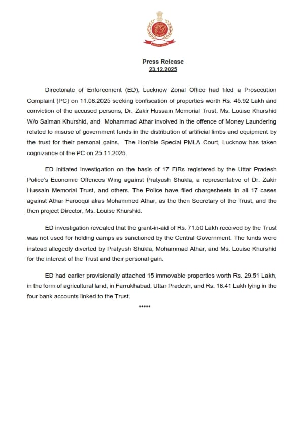 Lko Big Breaking डॉ.जाकिर हुसैन मेमोरियल ट्रस्ट पर ED की कार्रवाई!! ED ने मनी लॉन्ड्रिंग मामले में चार्जशीट की दायर!! दिव्यांगों के लिए मिले फंड के