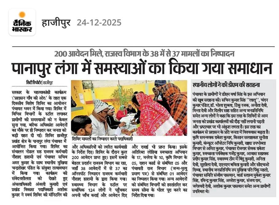 प्रशासन गाँव की ओर.... कार्यक्रम के तहत का एक दिवसीय शिविर हाजीपुर प्रखंड के पानापुर लंगा पंचायत भवन में आयोजित किया गया। इस शिविर कार्यक्रम को लेकर दैनिक भास्कर समाचार पत्र में प्रमुखता से खबर प्रकाशित किया गया है।
