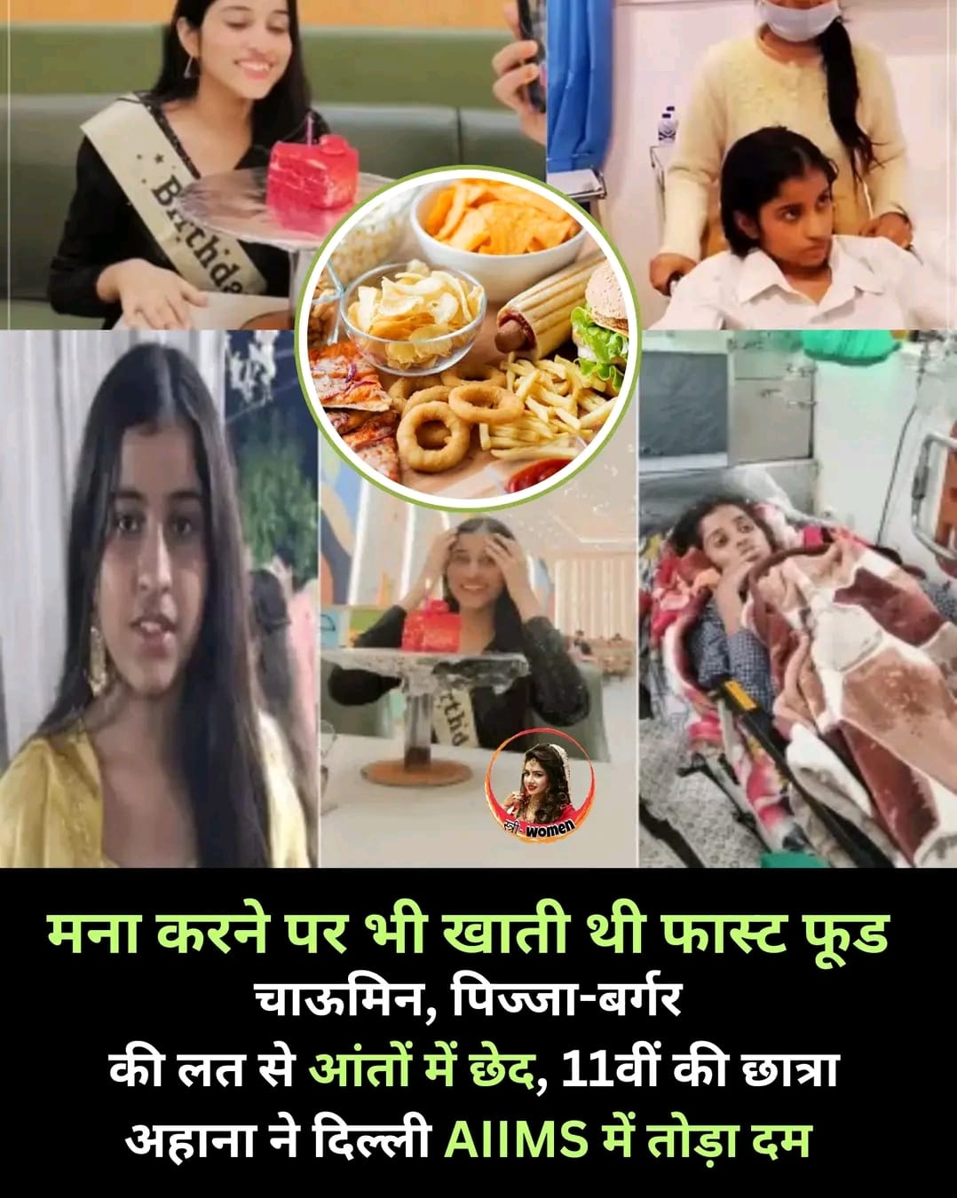 अमरोहा की 16 साल की छात्रा अहाना की मौत सिर्फ एक दुखद परिवारिक हादसा नहीं, बल्कि पूरे समाज के लिए चेतावनी बन गई है। क्लास 11 में पढ़ने वाली यह होनहार लड़की फास्ट फूड की इतनी ज्यादा शौकीन थी कि आखिरकार उसी आदत ने उसकी जान ले ली। रिपोर्ट्स के मुताबिक लगातार चाऊमीन, मैगी, पिज्जा और बर्गर जैसी चीजें खाने से उसकी आंतों को गंभीर नुकसान पहुंचा और दिल्ली AIIMS में इलाज के दौरान उसने दम तोड़ दिया।