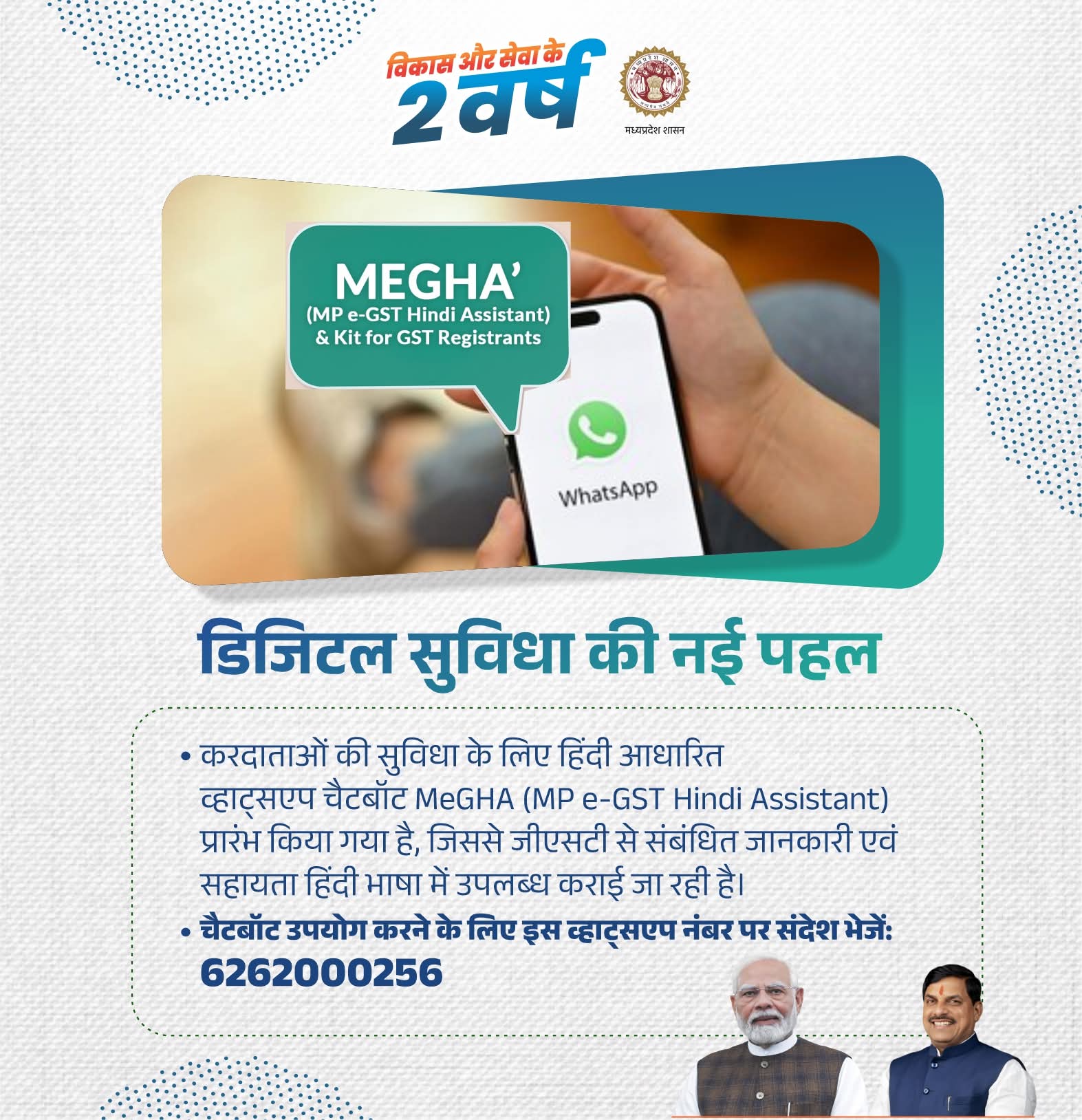 ▶️ करदाताओं की सुविधा के लिए हिंदी आधारित व्हाट्सएप चैटबॉट MeGHA (MP e-GST Hindi Assistant) प्रारंभ किया गया है, जिससे जीएसटी से संबंधित जानकारी एवं सहायता हिंदी भाषा में उपलब्ध कराई जा रही है।