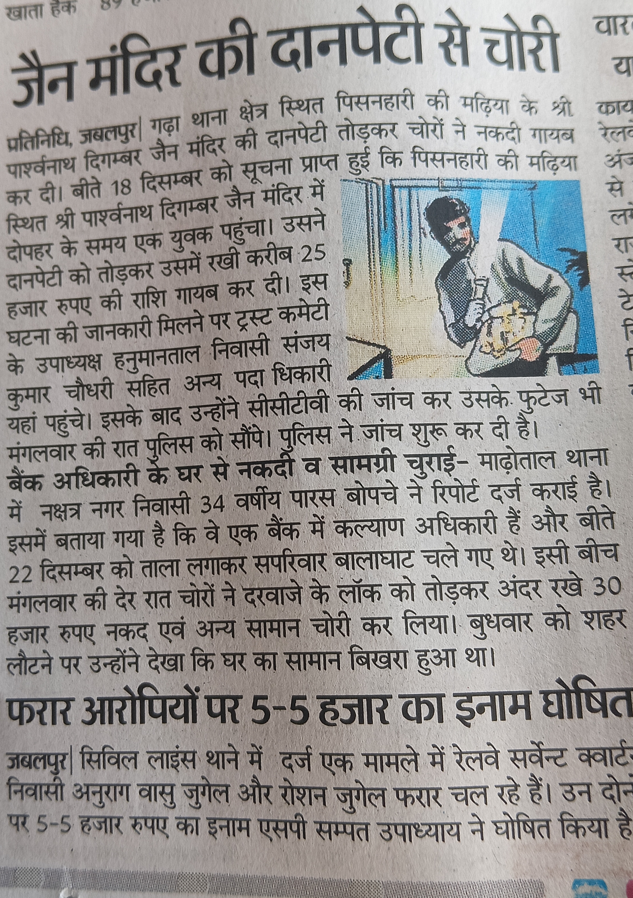 गढा़ थाना क्षेत्र स्थित पिसनहारी की मढिया के श्री दिगंबर जैन मंदिर की दान पेटी तोड़कर चोरों ने नकदी गायब कर दी